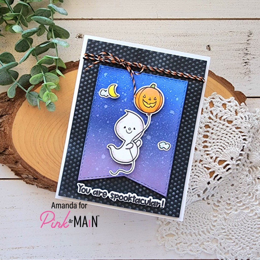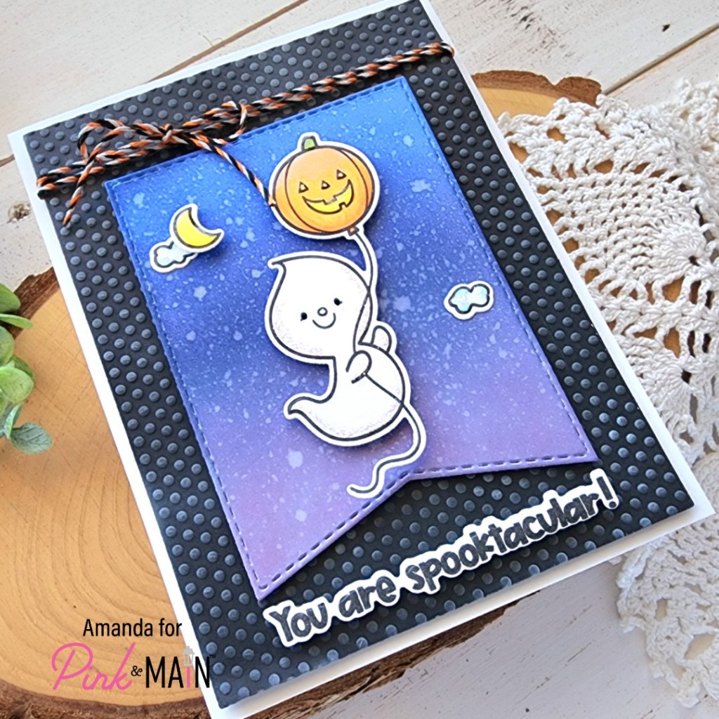 Today I chose images from the upcoming Cute Ghosts and Halloween Brew to create a little scene. I ink blended a white cardstock panel with distress oxide inks in wilted violet, blueprint sketch and chipped sapphire. After spritzing the panel with water and blotting it dry, I die cut it with a Large Fish Tail Banner. I glued the clouds directly to the panel and popped the moon and ghost up with foam squares.