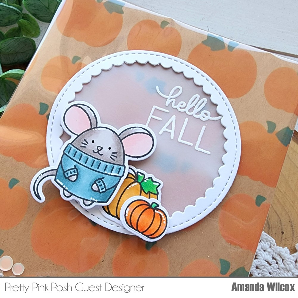 I chose some images from Cozy Fall Critters and Fall Corners, and colored them with my copic markers. I used the coordinating dies to cut them out and started arranging them on the card front. They kind of got lost so I pulled out the Scalloped Circle dies and cut one from white cardstock. I cut another circle from vellum and heat embossed my sentiment on it. I adhered the layers together and then to the card front before adding my mouse and his pumpkins to the bottom of it. One pumpkin is glued directly down and the other with the mouse are popped up on foam squares.