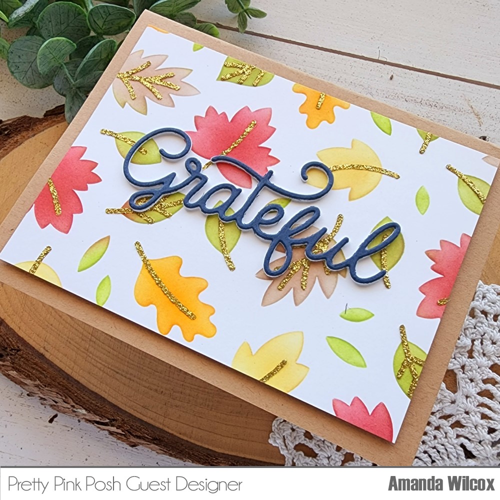 For the hop I created this simple but gorgeous fall card using the new Layered Foliage Stencil and Grateful Script die. I inked up the first layer with dye inks and blending brushes, not masking at all because fall leaves are never just one color so if things mixed a little I didn’t mind. Then I layered the second stencil on top and spread gold glitz glitter gel from Thermoweb through it. Isn’t that detail gorgeous?!?
