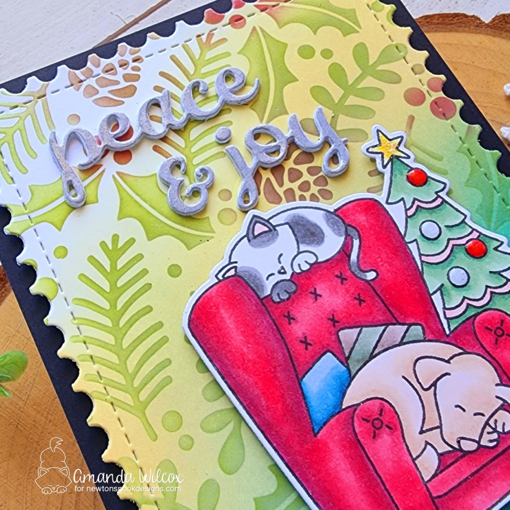 For my Christmas Nap card, I stamped and colored the image in some warm colors fit for winter. I used the coordinating die to cut it out and set it aside. This die set also has the word dies Peace & Joy in it so I cut them from white cardstock 4 times and adhered them together with liquid glue.