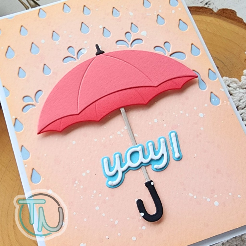 I chose white glitter paper for the raindrops and tied it back in as the shadow for my sentiment. The background panel is popped up with foam tape and the umbrella is popped up as well. I glued the handle directly to the card front and popped the sentiment up too. This held the handle in place since I didn’t have foam small enough for the skinny handle.