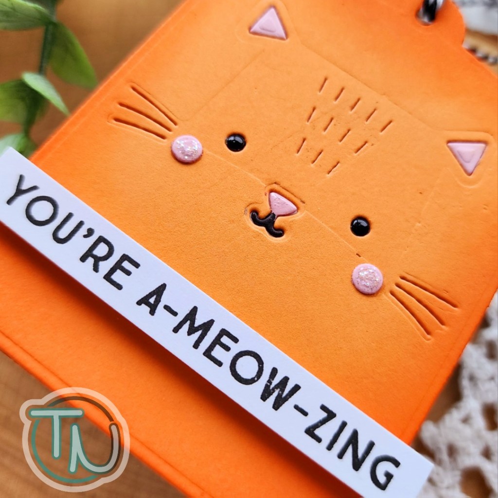 Our cats are far from this color but I just had to make a fun orange kitty tag today, partially because my daughter’s school colors are orange and black. I cut two tags – orange and white. On the orange one, I die cut the kitty face and then glued the tags together. This made it simple to inlay the little face details after cutting them from black and pink cardstock. There is a die in the Best Friend Faces set for cheeks and I made sure to add those too.
