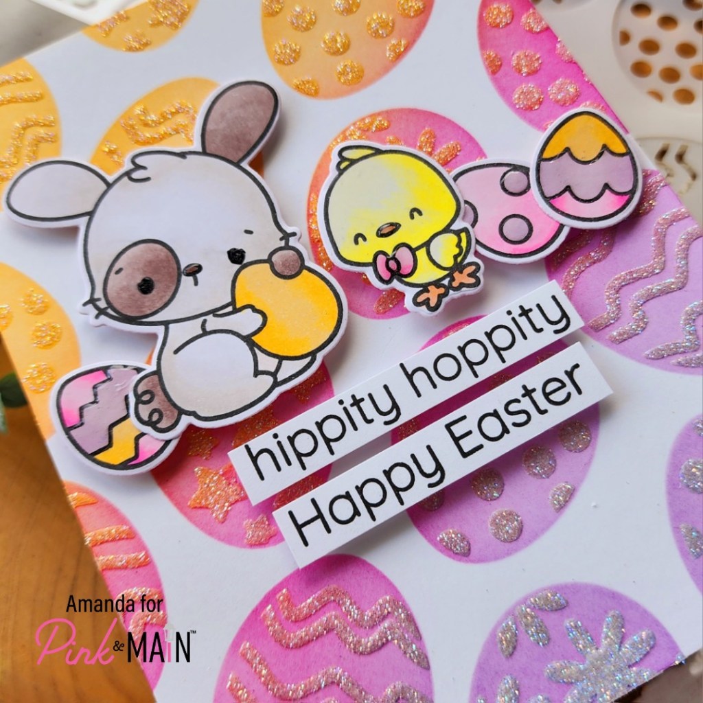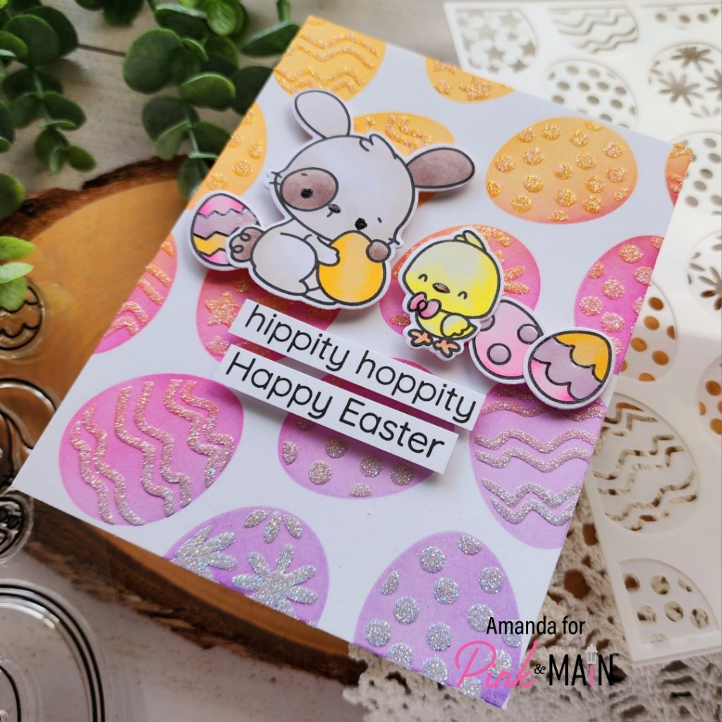 I started this card by creating my background with the Layered Eggs stencils and Pink & Main dye inks. Today I blended Night Sky, Dress Shop and Construction for a springy happy color palette. Starting lighter with the first layer, then adding the detail stencil over the top and using the same colors again. Then I spread Glossy Gel through the detail stencil and sprinkled the panel with Ice Ring super fine glitter.