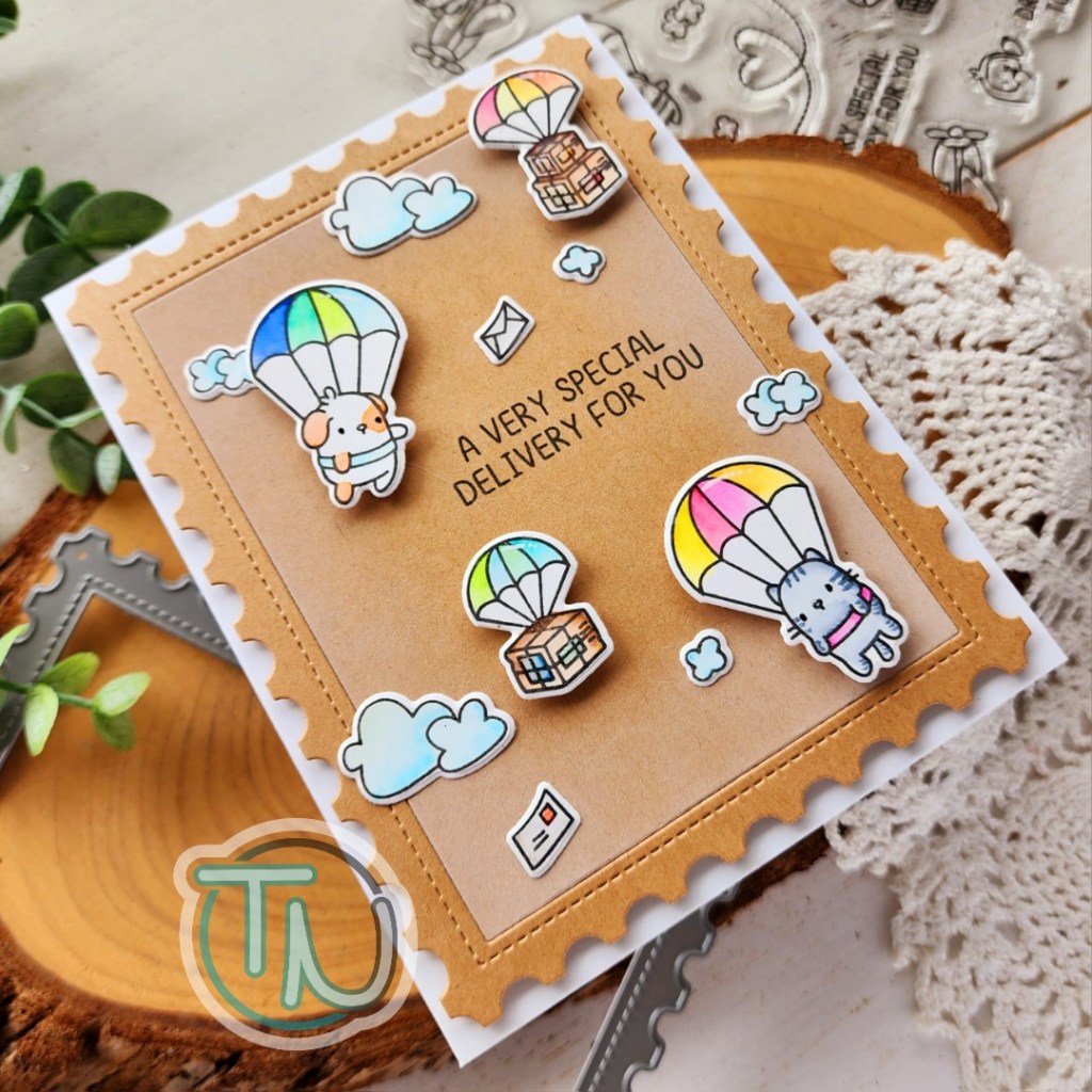 I came across the Postage Frame dies and realized I hadn’t used them yet, also how cute would they be with these floating packages and letters! So I cut the main die from kraft cardstock not realizing it cuts a frame and the center pops out. I took the opportunity to ink the edges on the inside piece with white pigment ink to make it stand out from the frame a little. Then I used my images as a guide for where to stamp my sentiment.