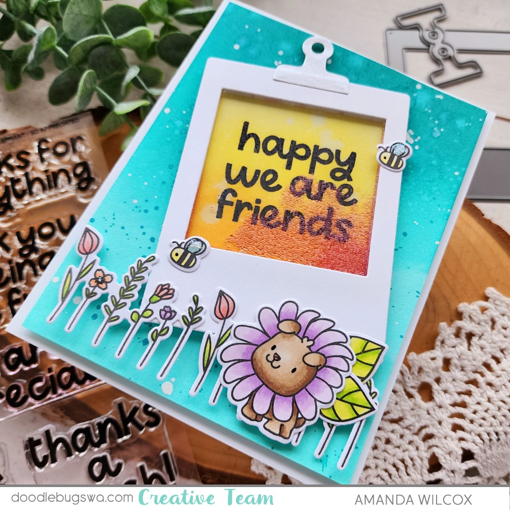 I had a general design in mind with the polaroid frame dies holding my sentiment and the sweet images from Flower Friends below. So I die cut my frame from white cardstock and took the inside piece that cuts out and ink blended it before stamping a sentiment. For that I chose carved pumpkin and squeezed lemonade distress oxide inks. I spritzed it with water and blotted it dry, then stamped my sentiment and adhered the cute clip to the top, which is a die included in the frame set.