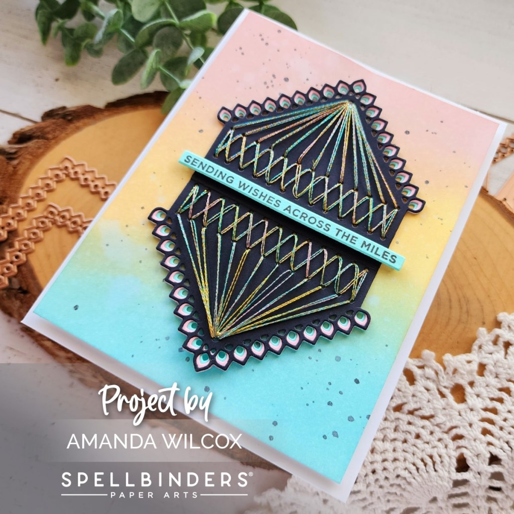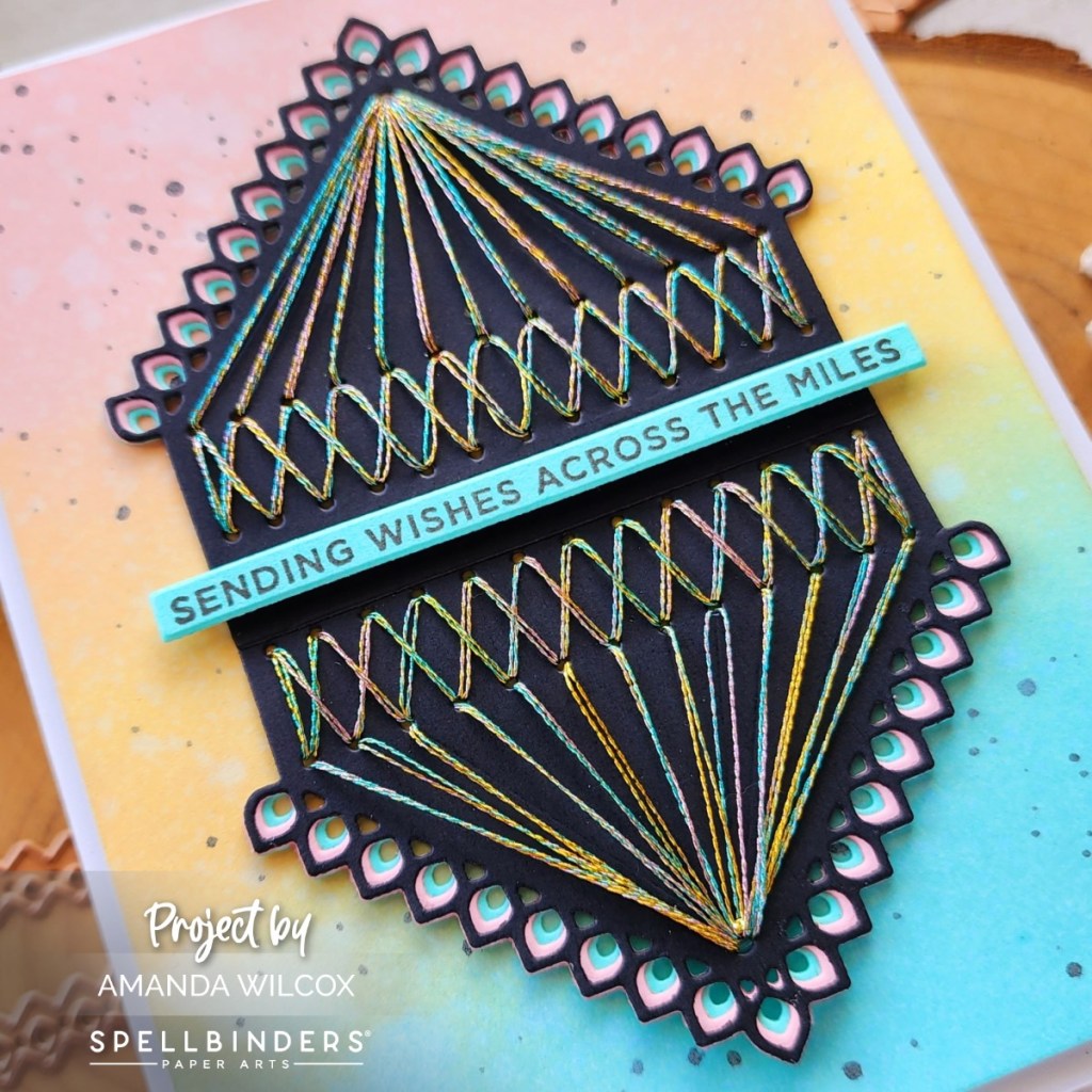 I cut the main piece from black cardstock and stitched it with a metallic variegated thread. Then I chose cardstock colors inspired by my thread to fill in the extra border pieces that come in the die set. After the stitching was finished, I adhered the two pieces together with liquid glue and added foam tape to the back.