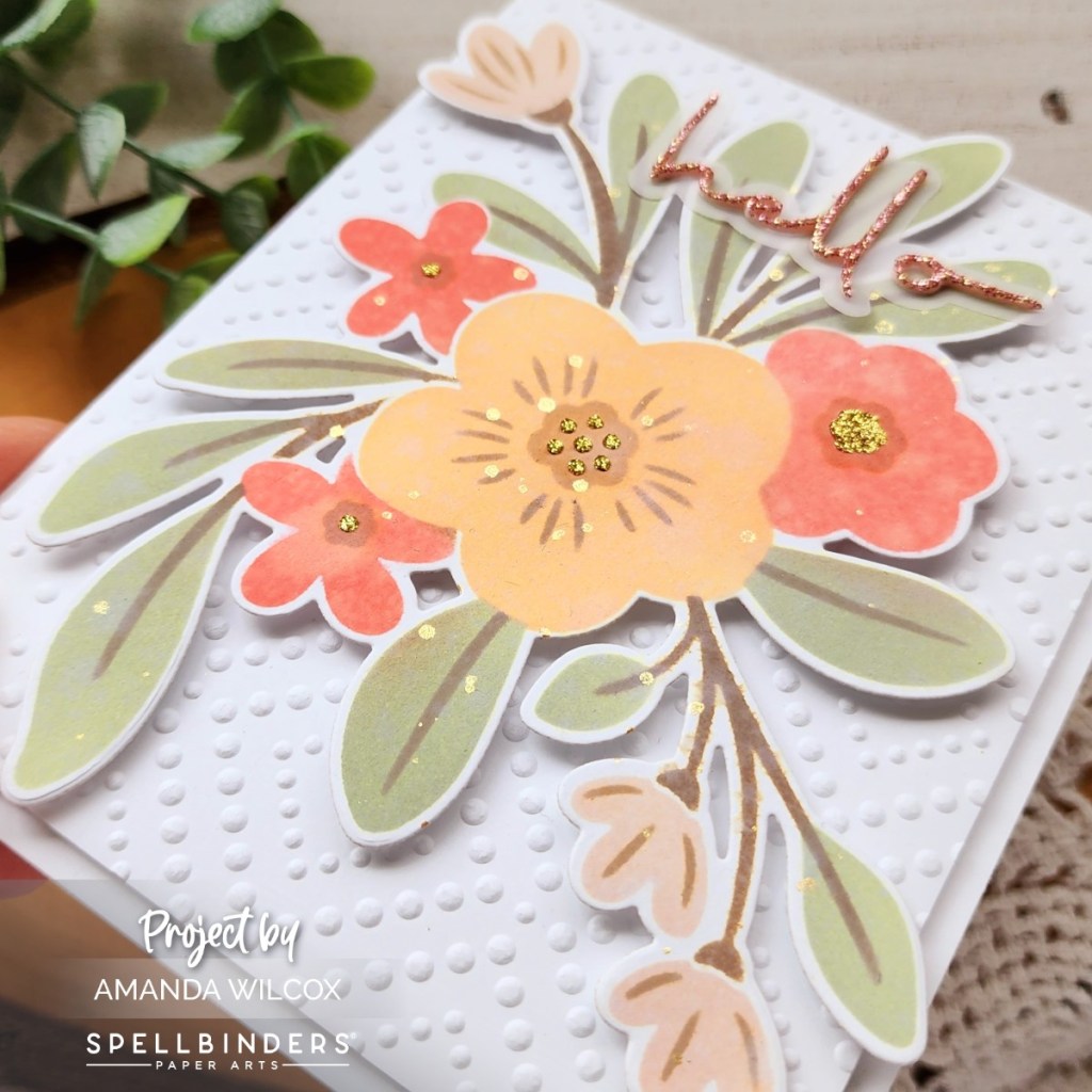 There is a wonderful hello die and shadow that comes in the set as well. I cut the word from glitter foam using the peach in the painted desert pack. I used liquid glue to adhere it to the vellum shadow and then to the flowers.
