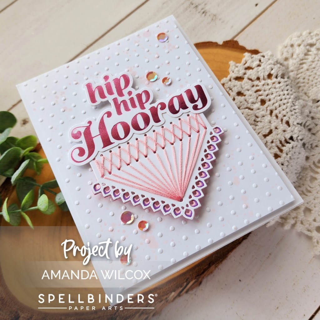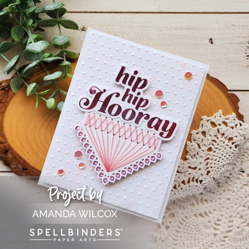 I loved how the Hooray sentiment perfectly covered the length of the Stitched Kaleidoscope Hexi-Gem die cut so I paired them together for a different look. I stitched in pink and added pink and purple layers behind the border. Then glued the hot foiled sentiment to the top edge.