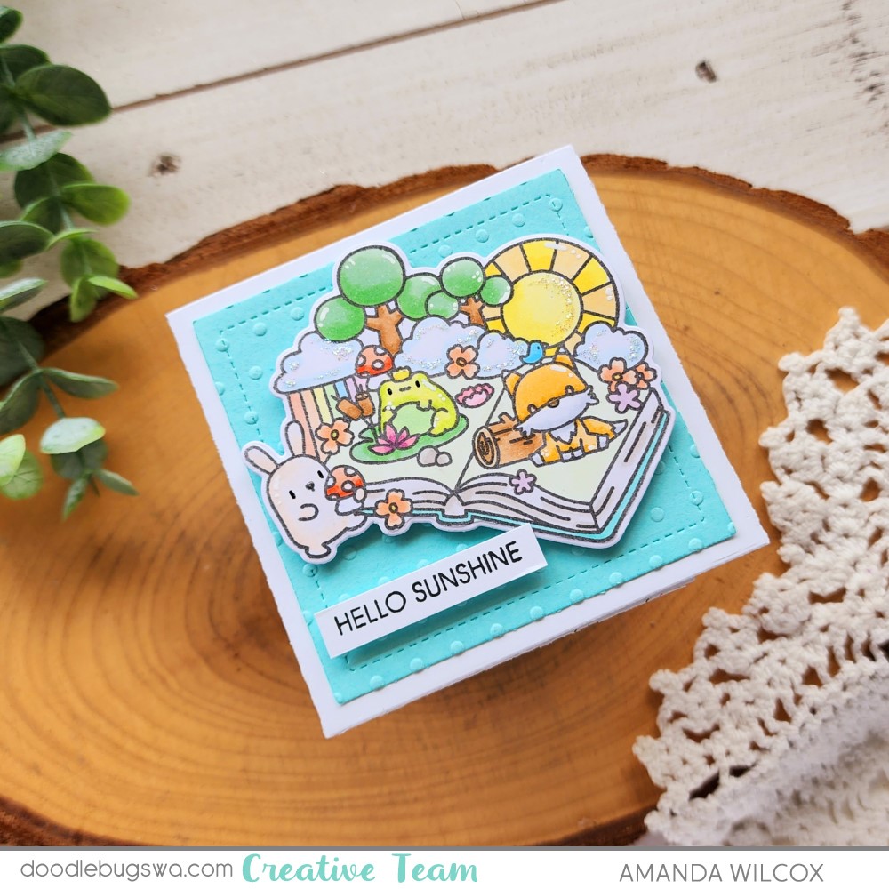 Then I found this perfect sentiment in the Spellbinders I’ve Got You Covered stamp set. After I stamped it, I just trimmed it into a strip and added it with a foam strip. For finishing touches I added some white gel pen highlights, black glaze pen to open eyes and stardust Stickles to the clouds and sun. Last, I did put little dots of glossy accents on noses and the frog’s crown.