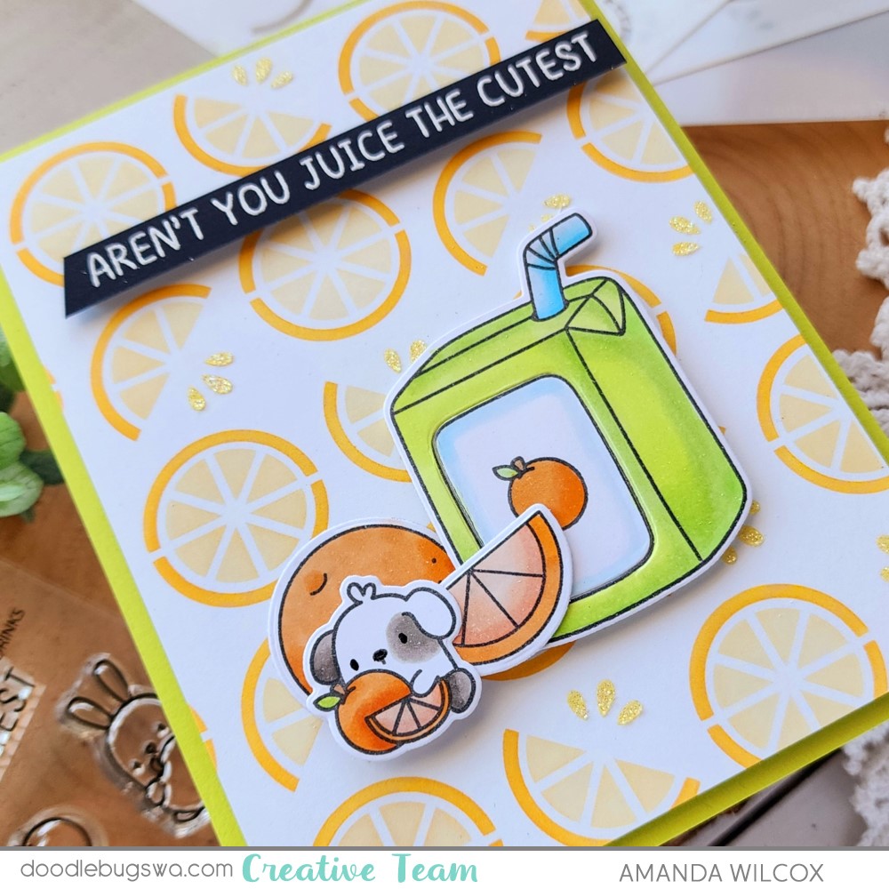 For my background, I inked up a white panel with the Pretty Pink Posh Citrus layering stencil. I used Lawn Fawn carrot and peach fuzz dye inks with blending brushes. Then I added a layer of iridescent glitz gel over the layer with juice drops for some sparkle. Once that was dry I trimmed the panel to 4×5.25 inches and popped it up on a green note card that matched my juice box.