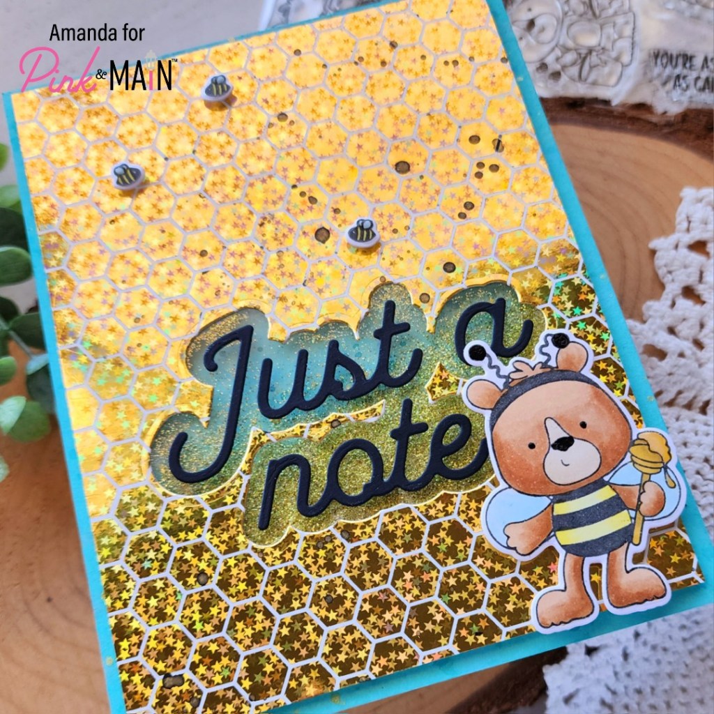 Starting things off I foiled one of the backgrounds in the Beeyoutiful Foilable Kit with Starry Gold CheerFoil. Then I used the shadow die from my sentiment to cut a window. I covered the window with acetate using EZ Tear Tape and lined the back of the panel with foam tape creating a well for my shaker glitter.