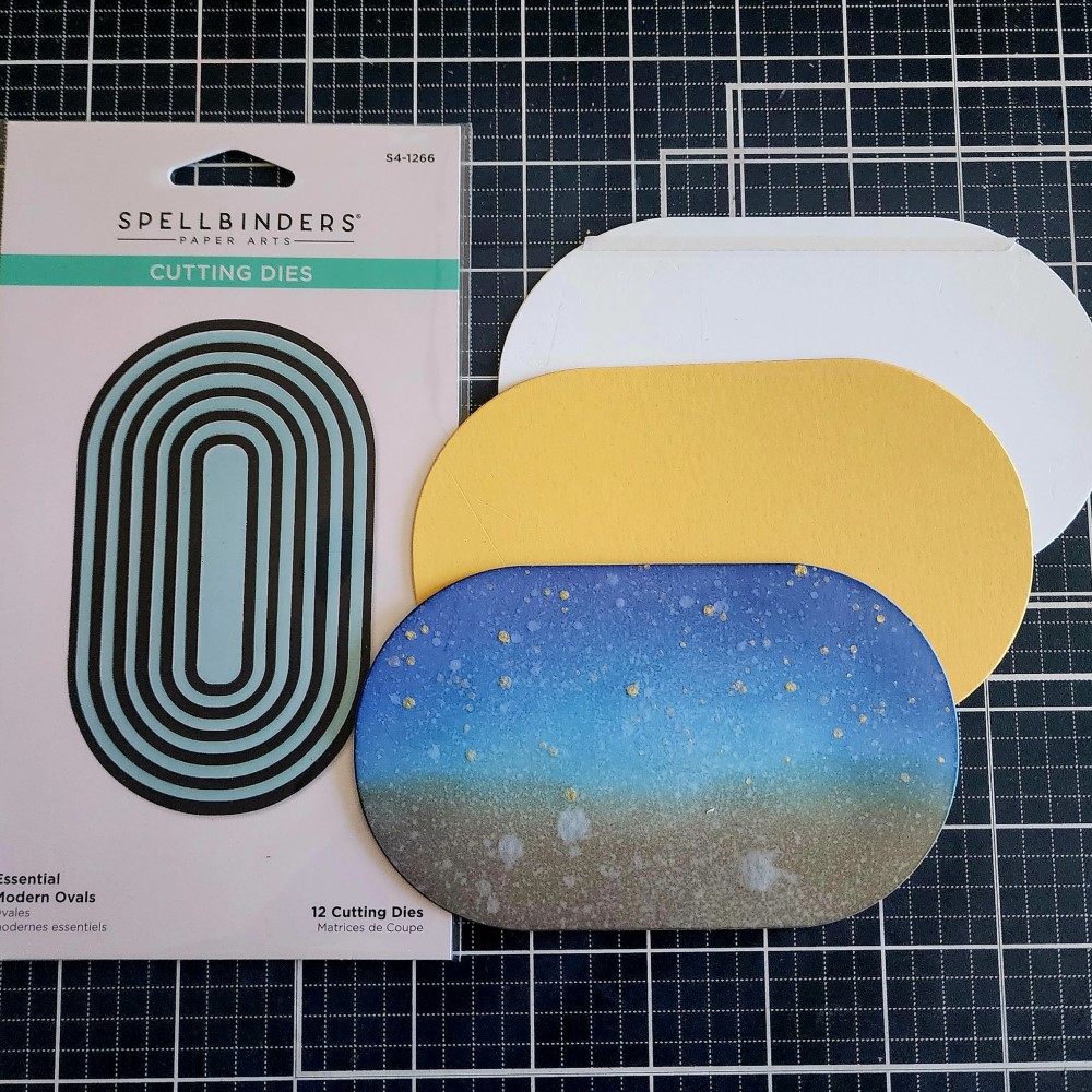 Then I cut the next smallest oval from blue cardstock and inked the top edge with chipped sapphire distress oxide ink and the bottom part with ground espresso. Then I spritzed it with my distress sprayer and blotted it dry. I also flicked gold watercolor on the top portion for some stars in the sky.