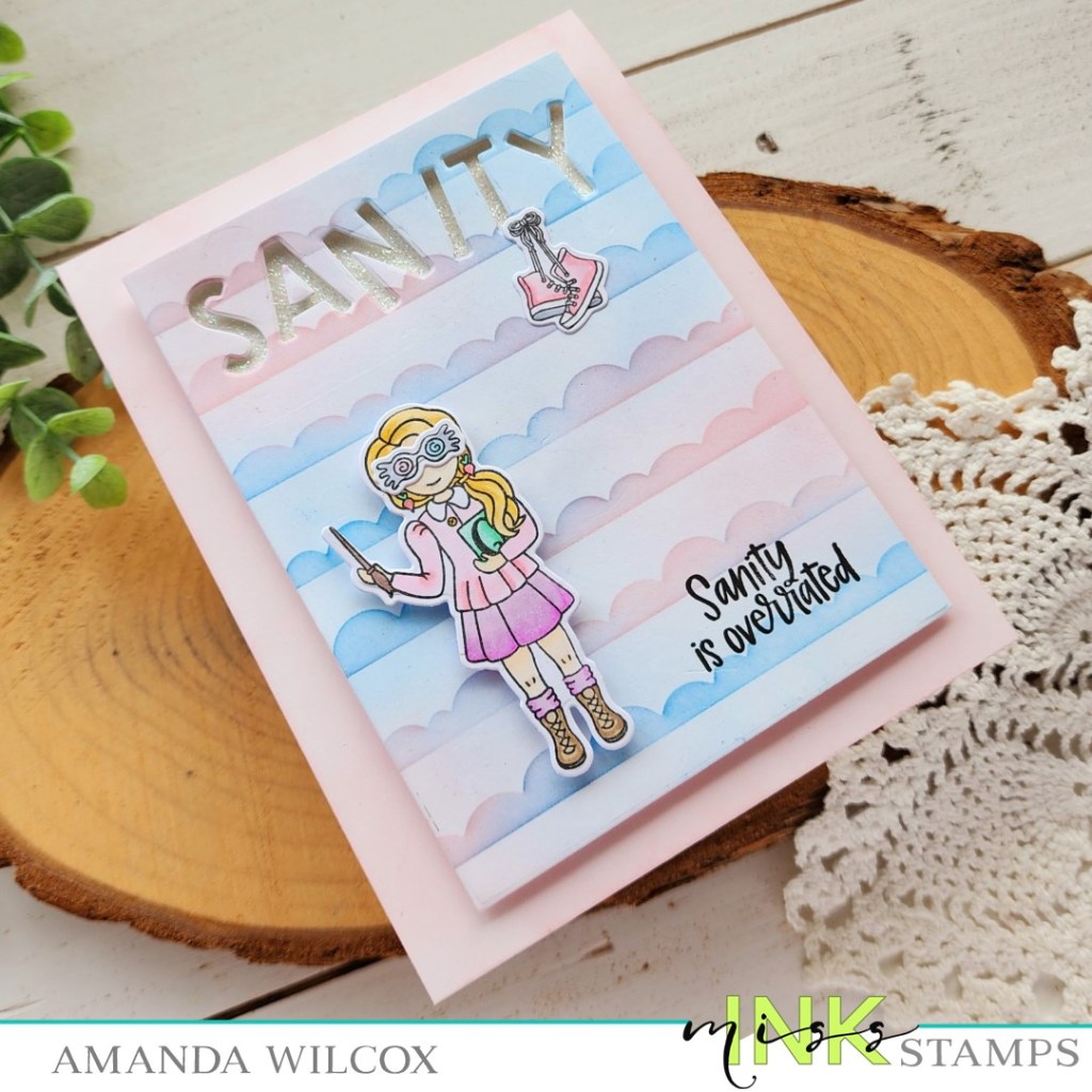 I took a piece of white cardstock and inked it up with light pink and blue dye inks using a blending brush, randomly. Then I used Pixie Spray on my Wonky Scallops stencil and stuck it to the panel. I went back over with the same colors in about the same places just darkening the pattern. After removing the stencil I taped the letters from the EIEIO dies spelling “sanity” and cut it from the stenciled panel.