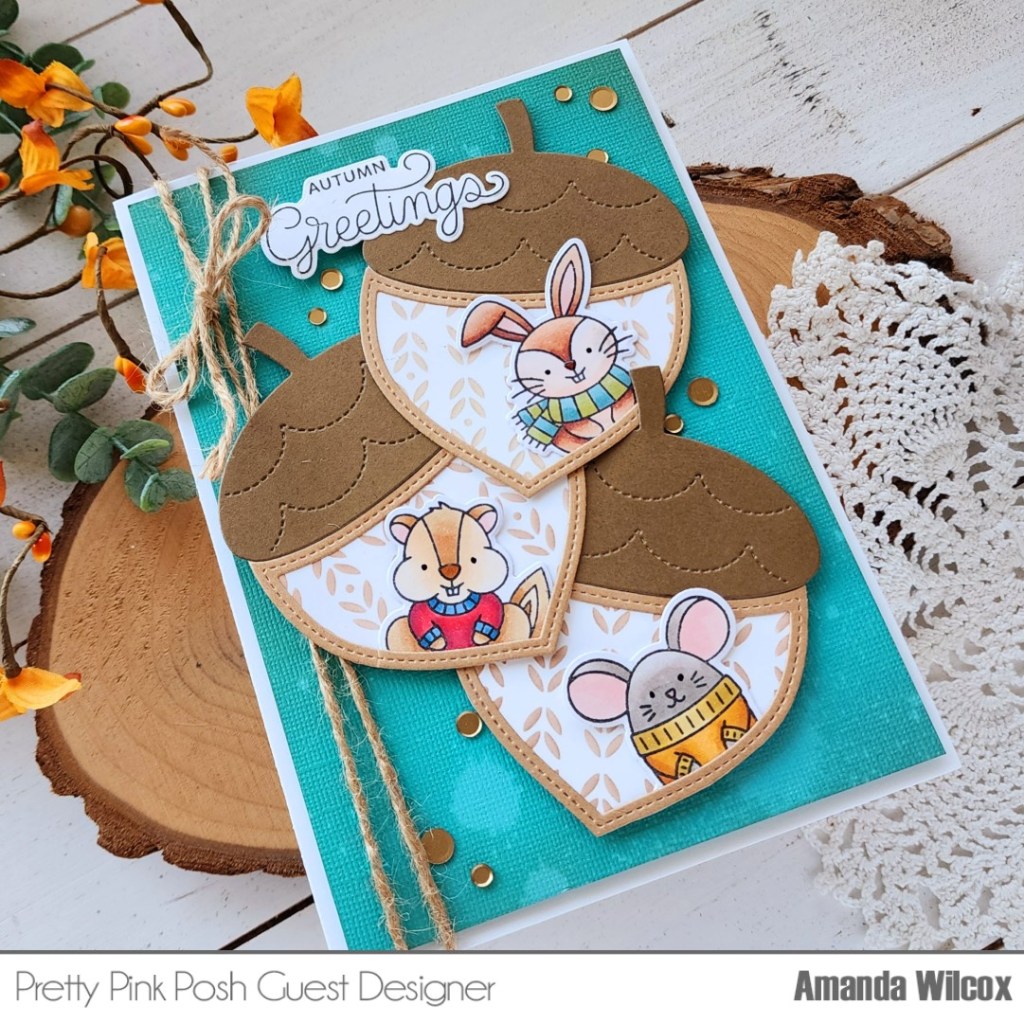 Welcome everyone. I’m excited to be on the Pretty Pink Posh blog sharing a card I created using the new Acorn Shaker dies and those adorable Cozy Fall Critters. Today’s card is a 5×7 card so that I could fit all three acorns on it without cutting too much off the edge. If you don’t like making large cards, you could reflect the design with only two acorns on a standard A2 card and it would be cute as can be!