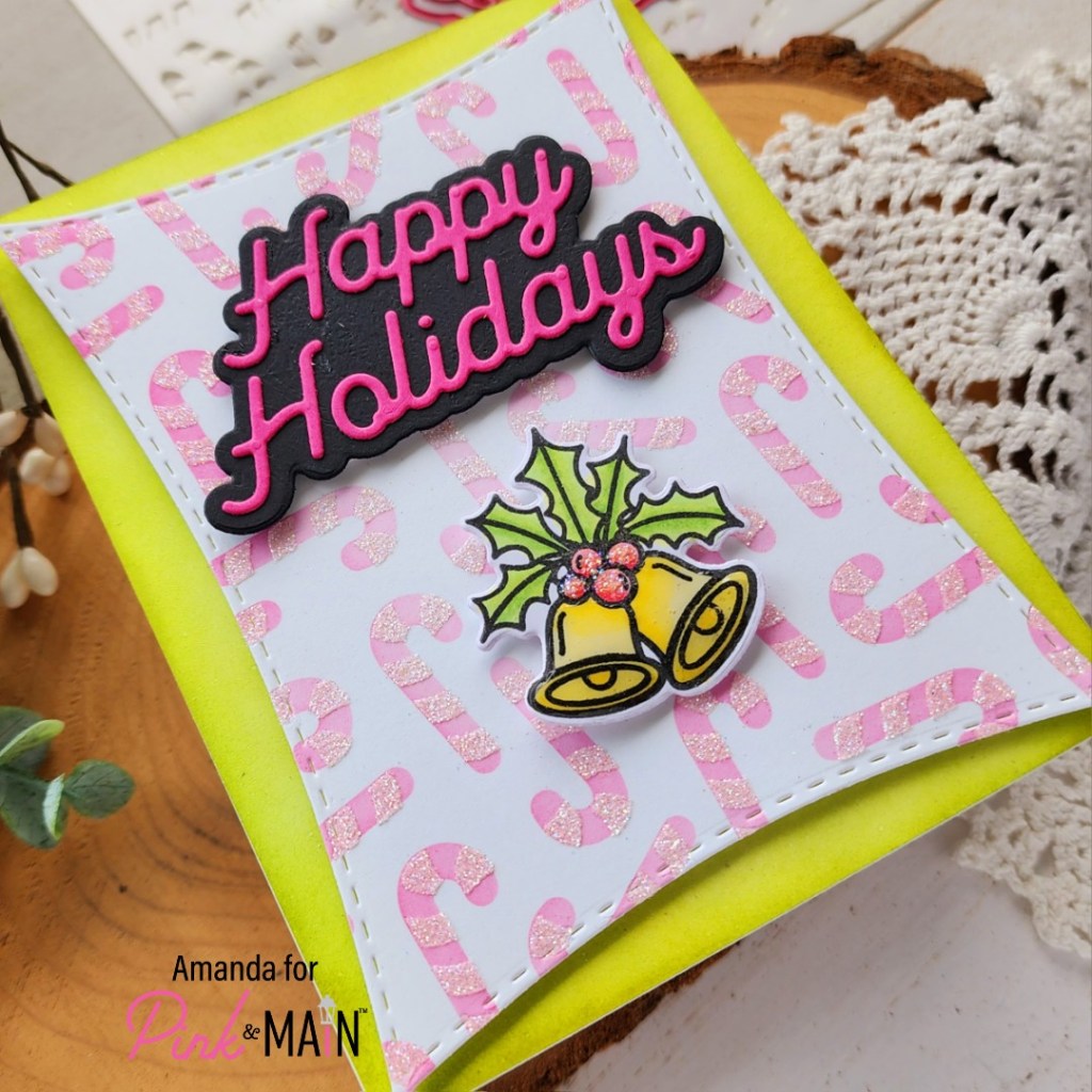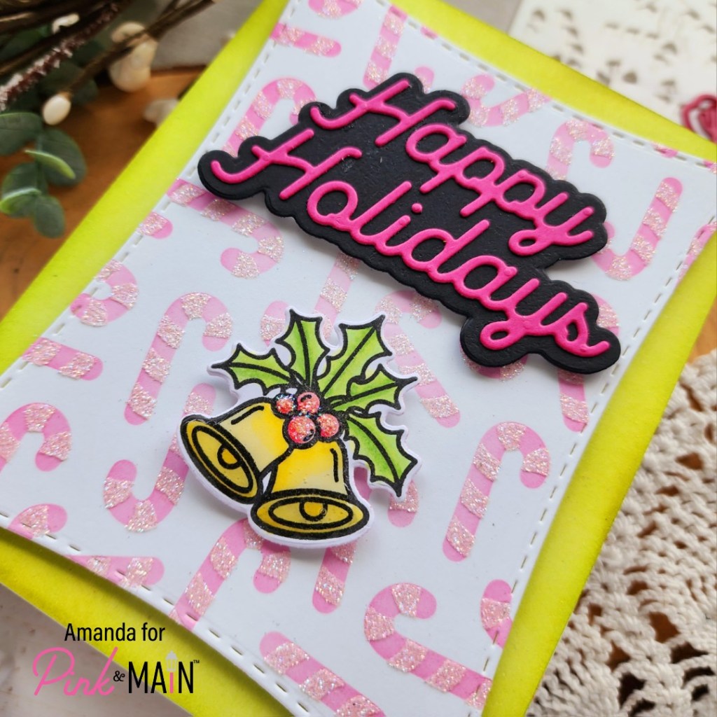 Once the glitter background panel was dry, I die cut it with a Concave Stitched rectangle and assembled everything with foam tape. For finishing touches I added Touch of Gloss to the bells and stardust Stickles to the holly berries so they matched the candy canes.