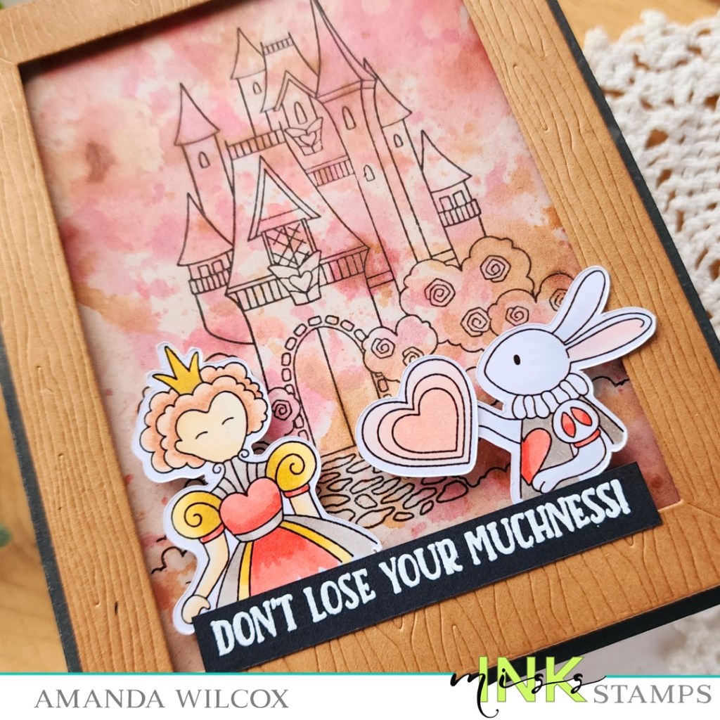 For my background on this card, I stamped the Queen’s Castle image on white cardstock and did ink smooshing with Tombow Brush Markers and a spray bottle. I chose a couple of reds and then threw in a brown at the end to tame it all down. Do you spy that new cool woodgrain frame too? That’s coming soon to the Miss Ink Stamps shop as well with more goodies to go with it.