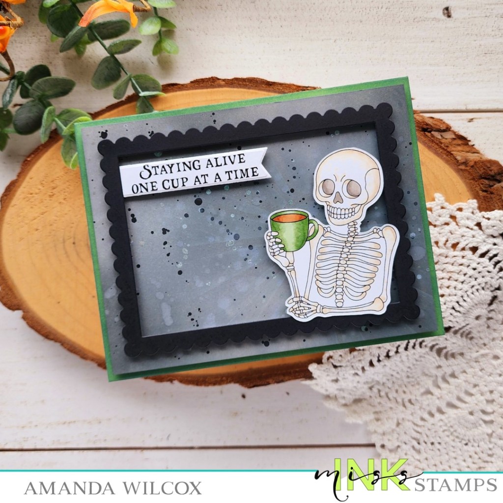 I cut a black frame from the Oh Happy Day die set and popped it up with foam strips and then added my image and sentiment banner the same way. It’s like the skeleton is leaning on the coffee counter window chatting with his buds and it totally cracks me up!