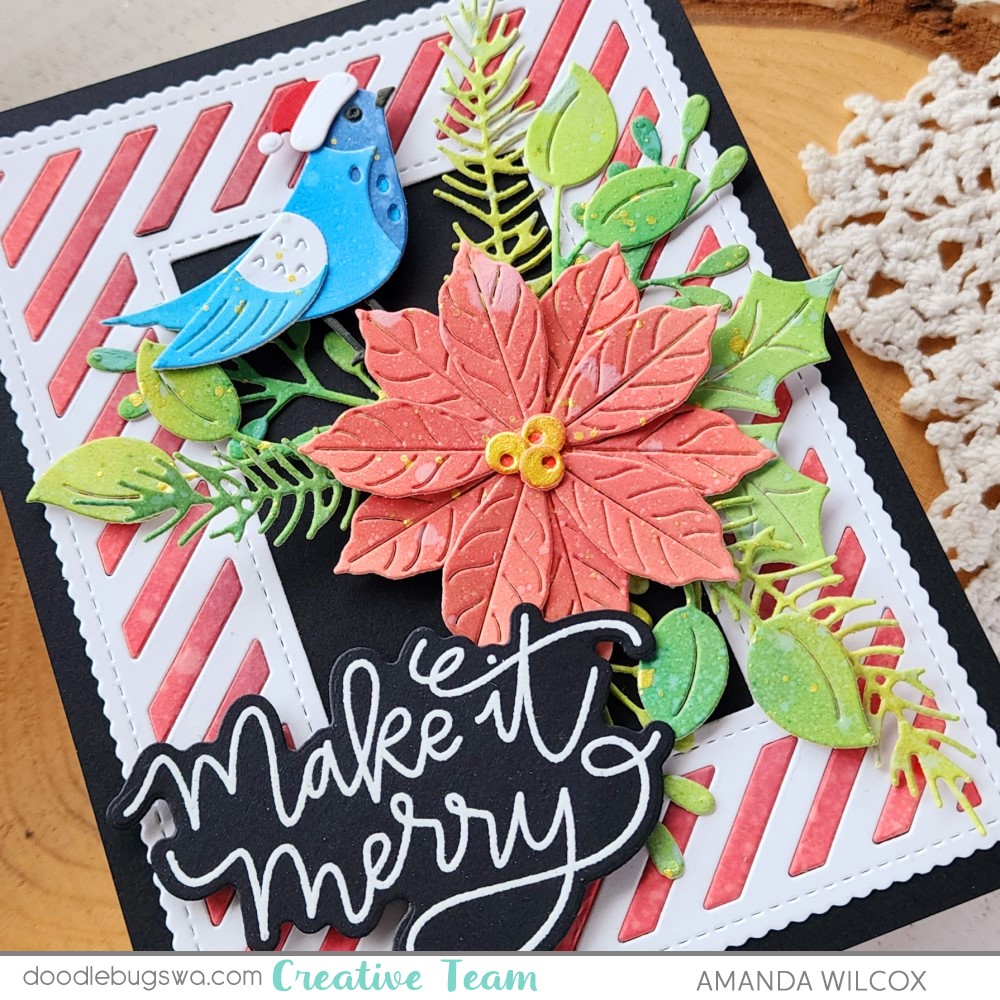 I added my foliage and bird with foam squares. Then for a sentiment I stamped and heat embossed Make it Merry from Mama Elephant’s Make It Merry set and used the coordinating die to cut it out. It’s also popped up with foam squares.