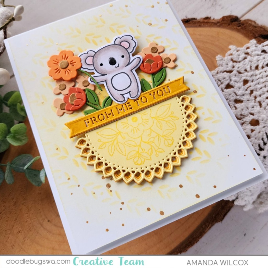 Next, I chose orange cardstocks and a good green to die cut all of my floral pieces. These are also included in the Kaleidoscope Arch dies. I used gold metallic paper for the flower centers and adhered everything together with liquid glue. You all know I love my critters, so I went digging and found this sweet koala from Pretty Pink Posh Crafty Critters to color and die cut. When I was playing with placement for the florals and koala I thought it would be cut if he help a flower so I cut another one and glued everything in place…again, liquid glue. I really value that wiggle room time you get with that versus a tape runner that adheres immediately.