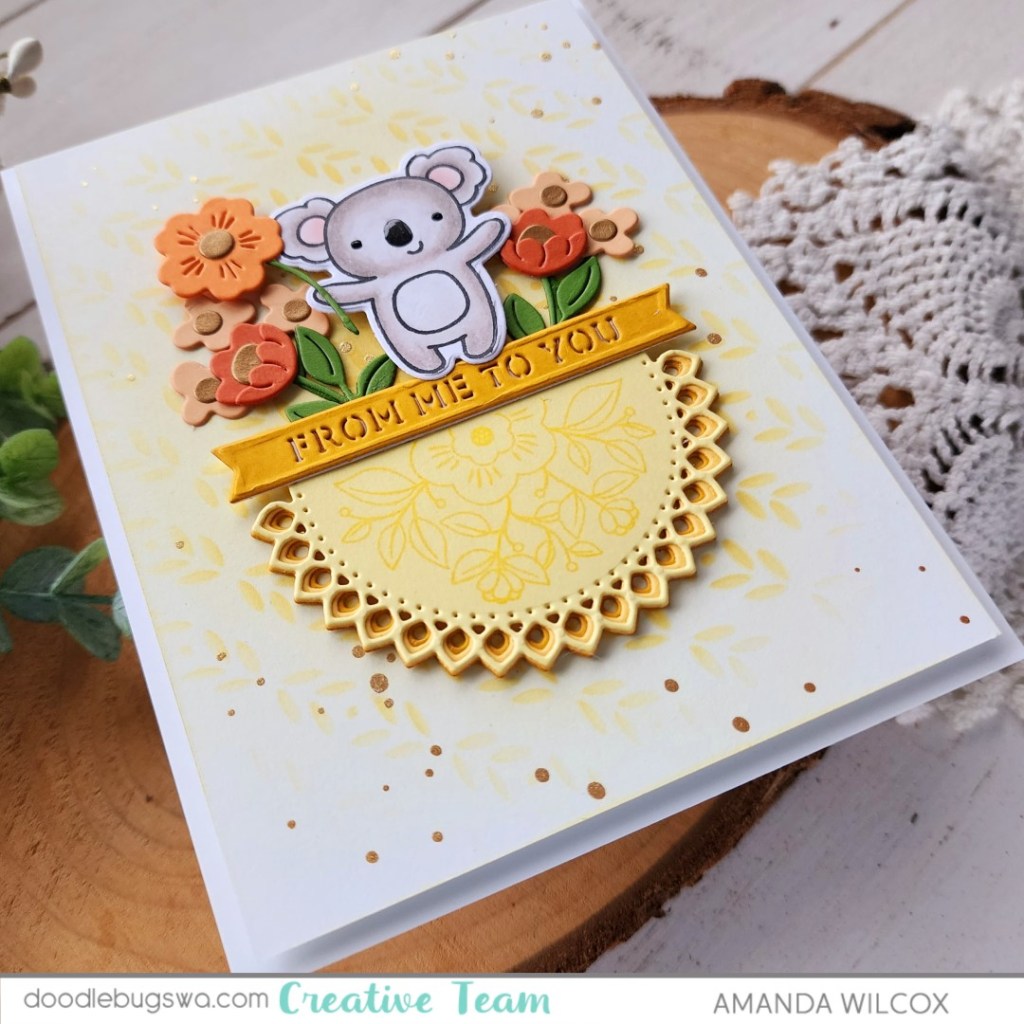 Okay, now that everything is dry we can layer everything together. I added foam tape to the stenciled panel and popped it up on a white card base. Then I added foam squares behind the koala and the flower he is holding but that’s all. Everything else has layers behind so this little bit of foam keeps everything the same height. I removed foam release paper and added liquid glue to everything else and popped my focal image in the center of the card front.