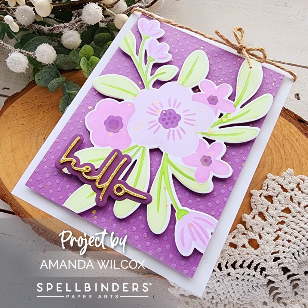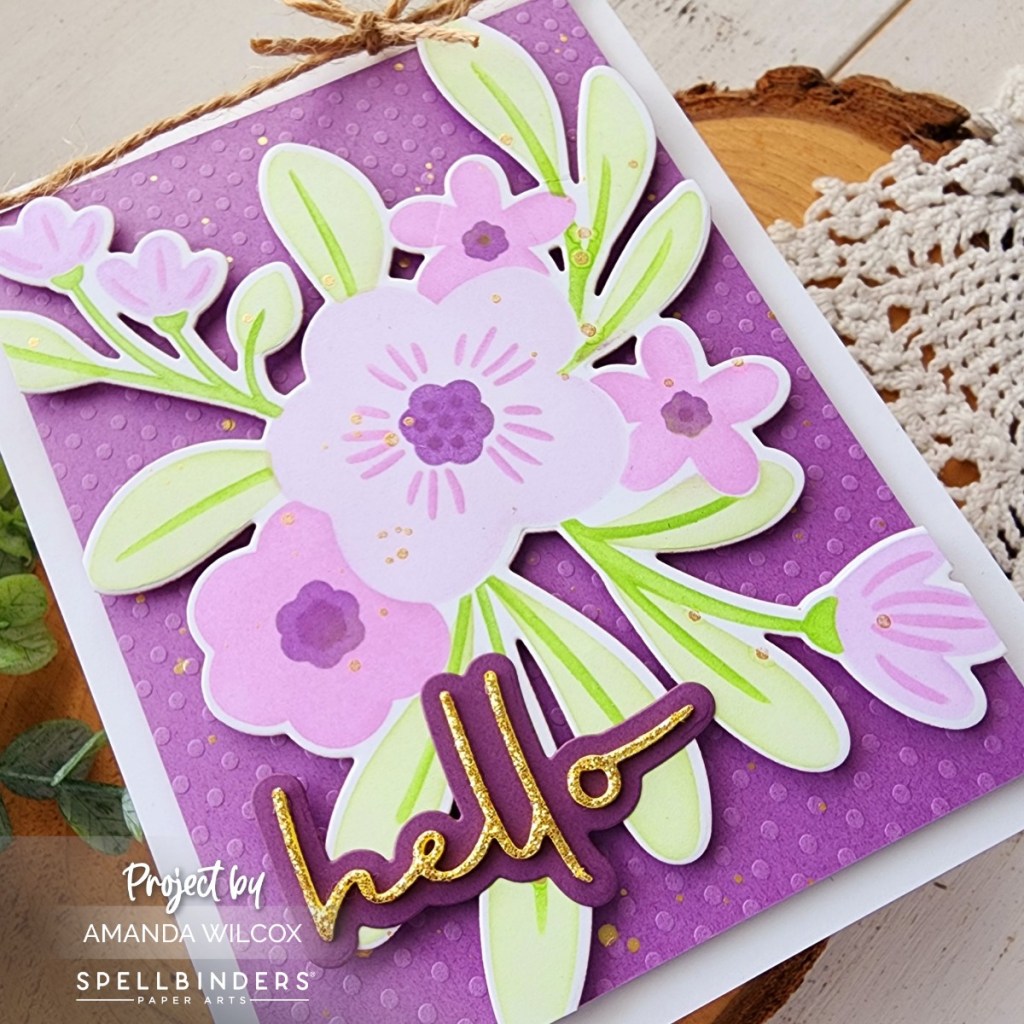 After stenciling, I used the coordinating die to cut the florals out. I cut a piece of dotted cardstock from my stash to 3.75×5 and popped my floral up on it with foam squares. I trimmed the excess off and lightly splattered the panel with gold watercolor. Letting that dry, I cut the shadow for hello included in this set from dark purple cardstock and the word itself from Spellbinders die cutting glitter foam. I’ve said it before and I’ll say it louder for those in the back…this stuff is AMAZING!!!!!!!! I highly recommend at least the basic colors in your stash if you like to die cut words and shapes from foam.