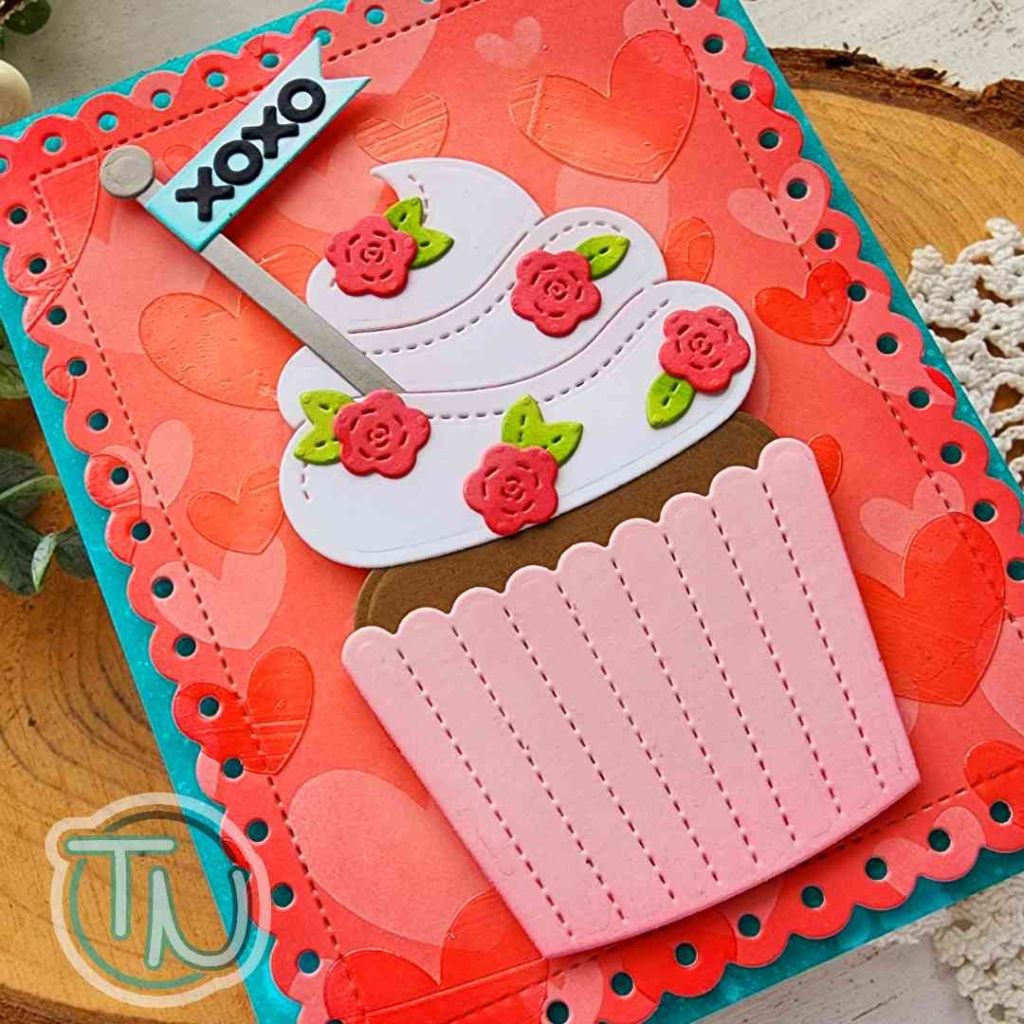 When the panel was dry I cut it out with the largest Eyelet Rectangle die. I inked the edges of my card base with peacock feathers distress oxide ink and splattered it with water before popping the stenciled panel up with foam tape. Then I added the cupcake to the with foam tape as well.
