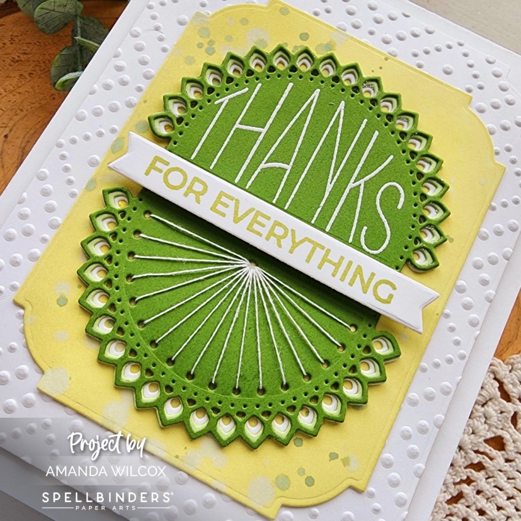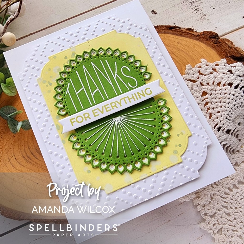I started by die cutting the two half rounds from the Stitched Kaleidoscope Arch die set and the layers for the eyelet openings as well. I used liquid glue to adhere those on and then chose to heat embossed the top half of my sentiment in white and mirror the white on the bottom with my stitching. I’m loving these green hues!