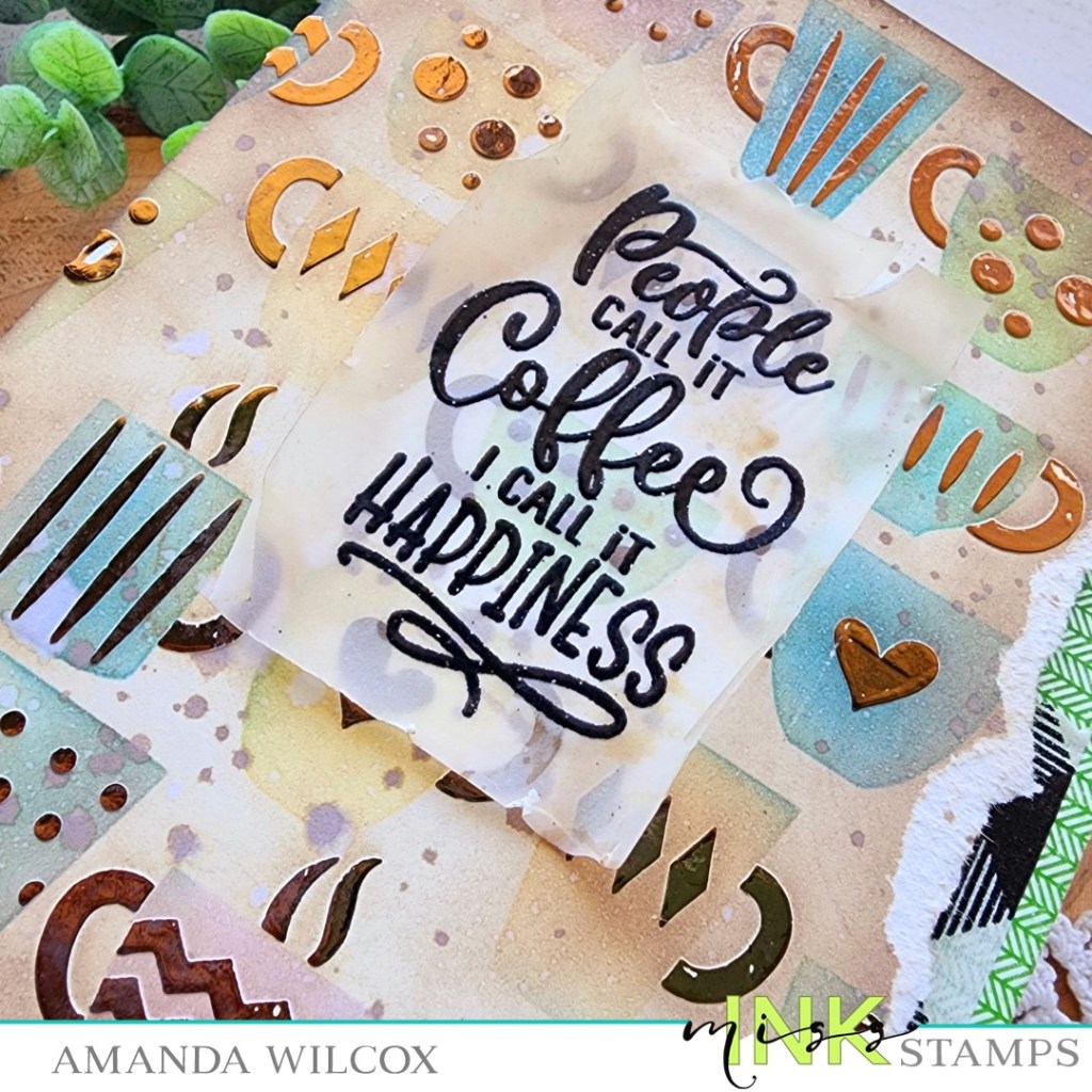 I started the process by inking up the mug layer of the Hug in a Mug stencil set with various bright colors. Then I added the layer with the handles and mug details and spread Thermoweb transfer gel blanco through it. While that was drying, I stamped and heat embossed a sentiment from the Coffee stamp set on vellum.