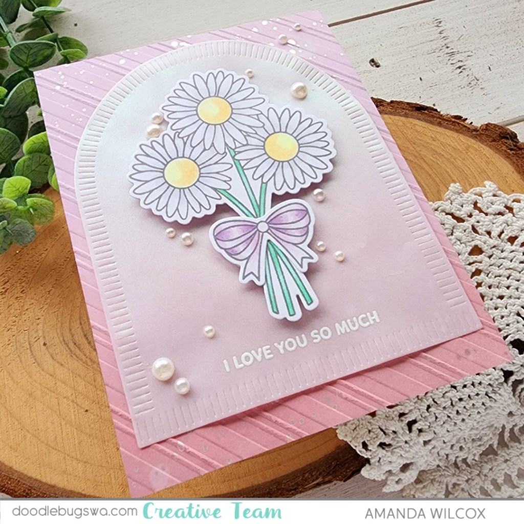 I started by stamping and coloring images from Pretty Pink Posh Daisies with copic markers. I chose a gray copic-friendly ink to soften the look of everything too. Once they were colored, I used the coordinating dies to cut them out and liquid glue to adhere the bow in place.