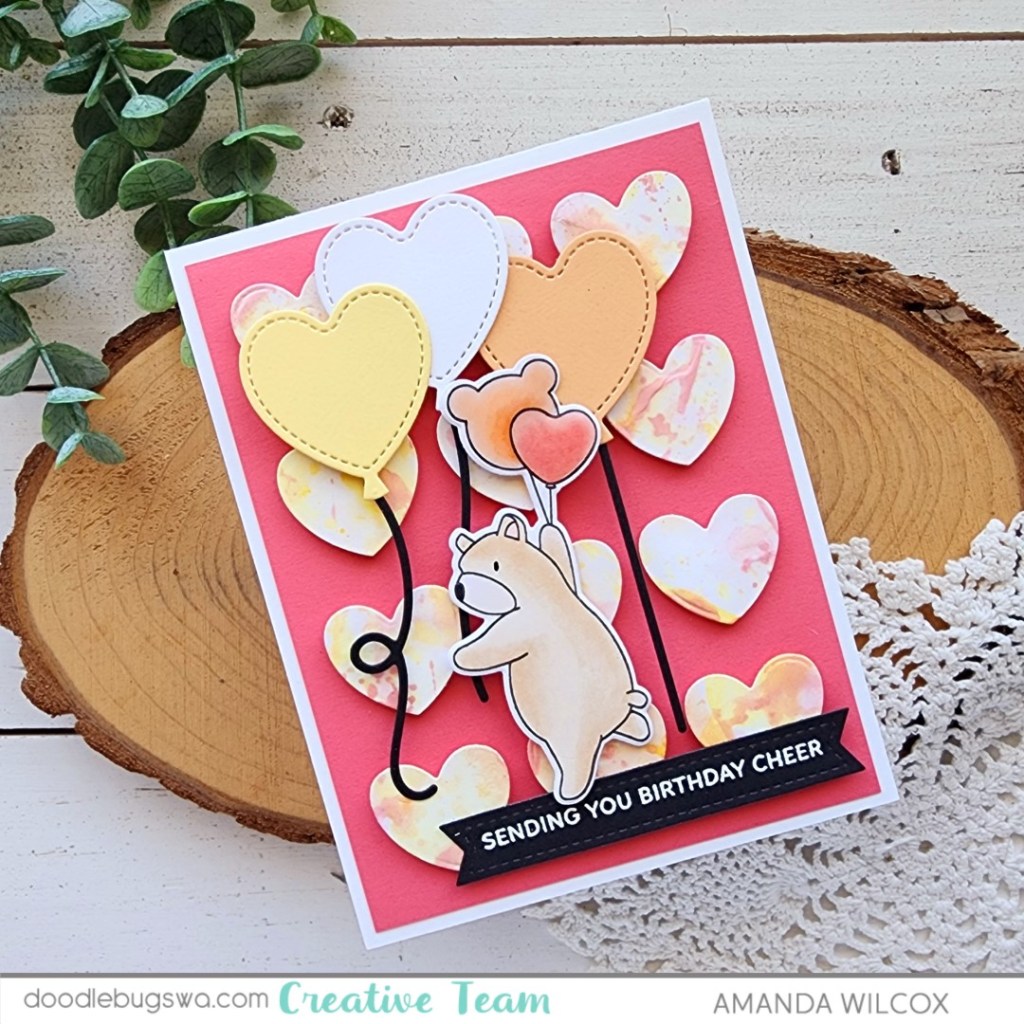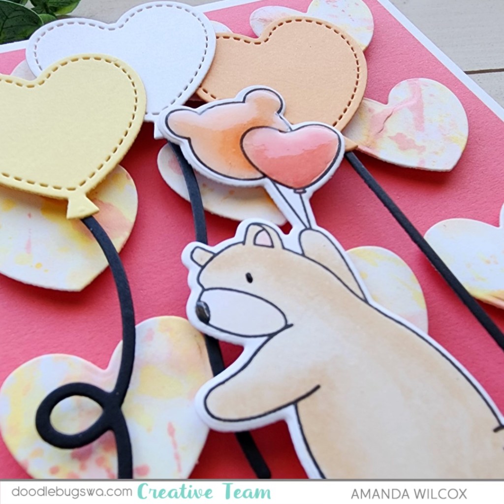 After adding the extra balloons and image to the design with foam squares, I stamped and heat embossed sentiments on sentiment strips, that are added with liquid glue and foam strips. For finishing touches I added black glaze pen to each bear’s eye and glossy accents to his nose and the balloons.