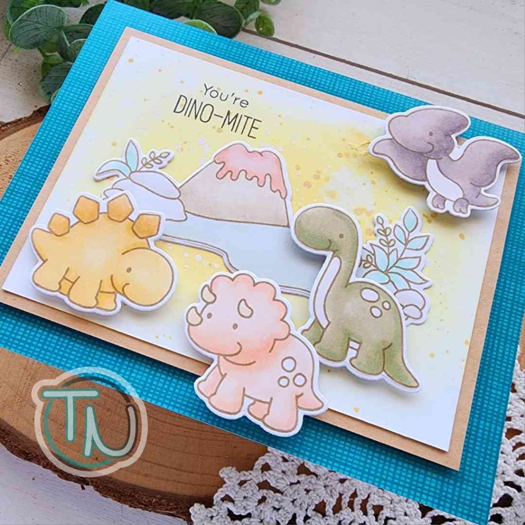 Using my images as a guide, I stamped my sentiment and then started assembling all of the layers. The ink blended panel is glued to the kraft one with liquid glue, then popped up on the patterned paper with foam tape. Then the volcano image is glued to the inked panel with liquid glue and the dinosaurs are all added with foam squares.