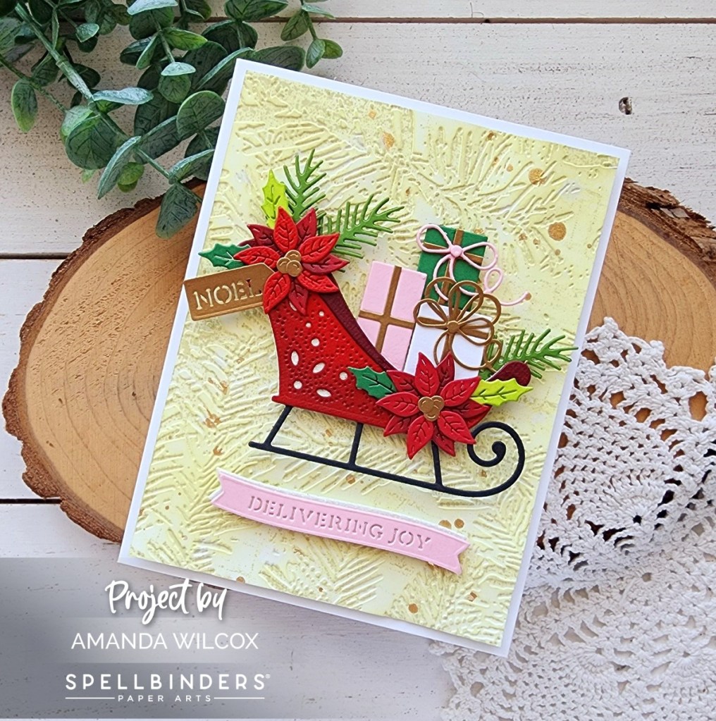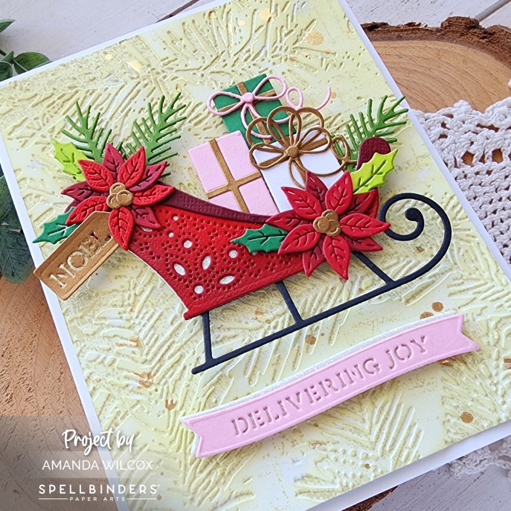 My first card today uses a couple of products from the Handmade Holidays Kit Add On selections. I built the gorgeous Delivery Joy Sleigh using various cardstocks in my stash and liquid glue to assemble all the pieces.