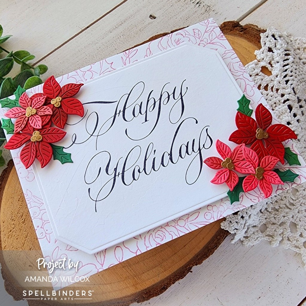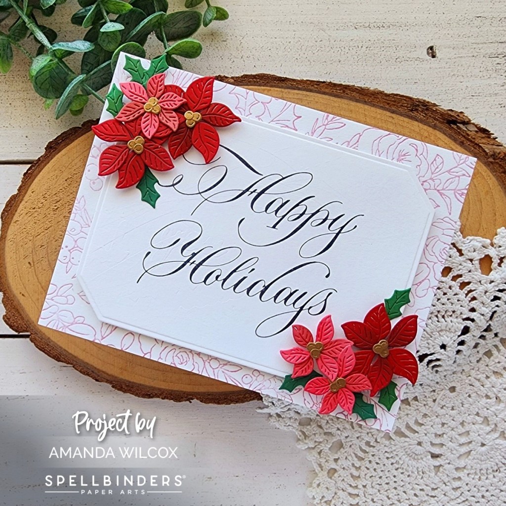After popping the label up with foam tape, I created some poinsettias from the Poinsettia Spray die set and popped them up in opposite corners with foam squares.