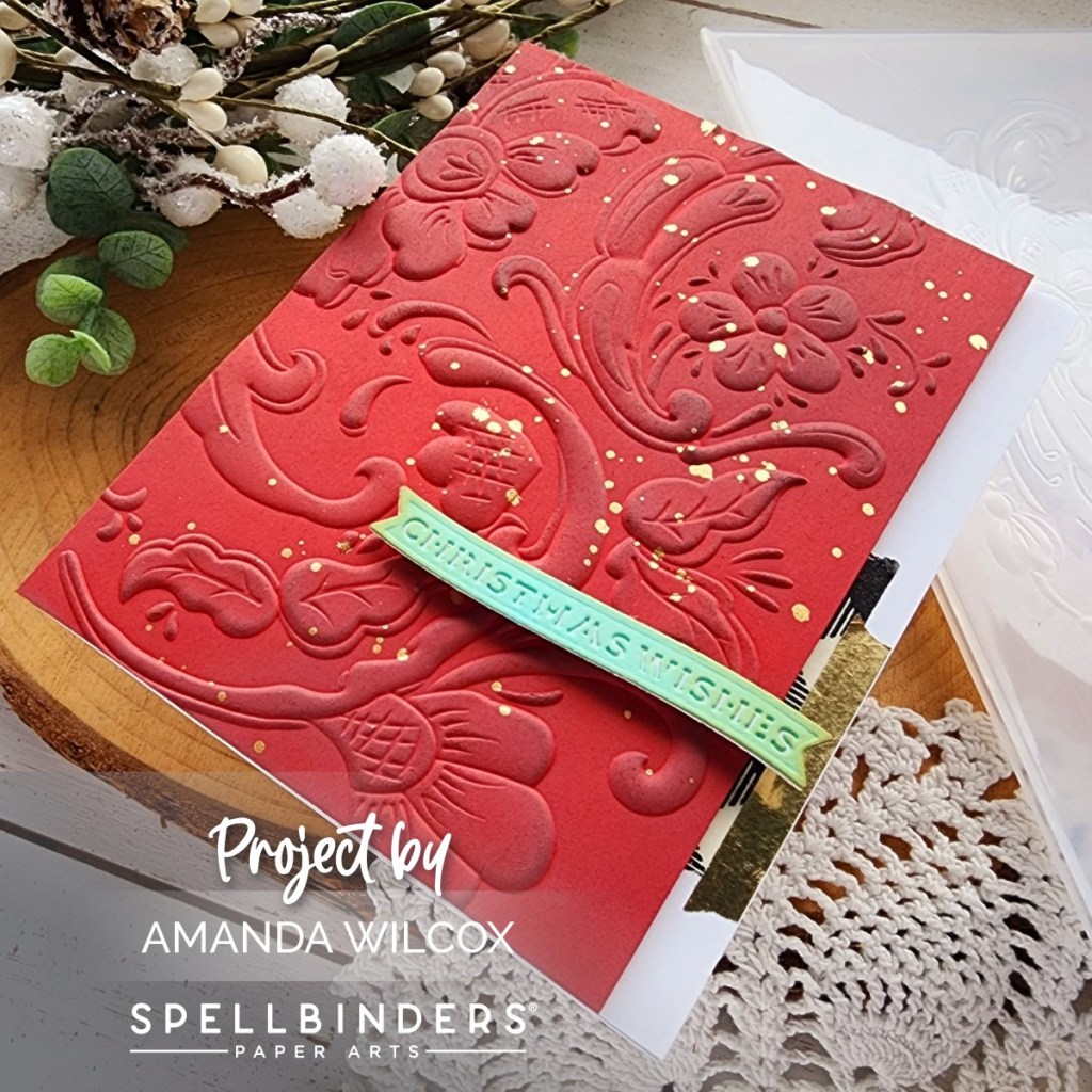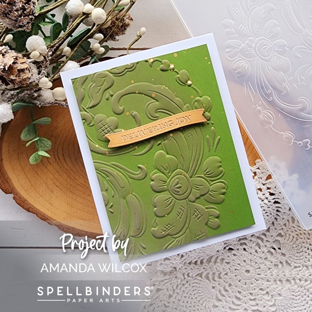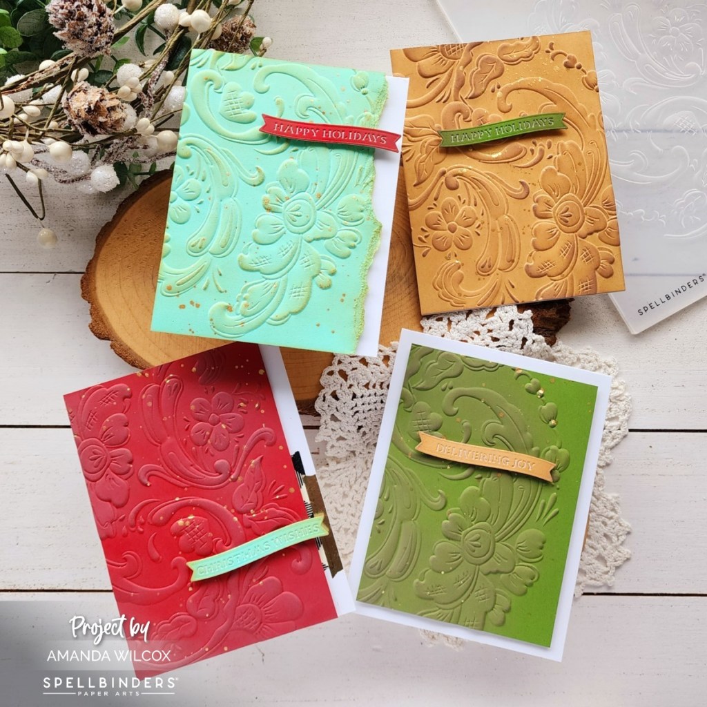 I’m highlighting the Spellbinders Norwegian Rosemaling 3D Embossing Folder and the banner dies from the Delivery Joy die set for all 4 cards I’m sharing today. I also used the same 4 colors of cardstock throughout, mixing and matching the combos.