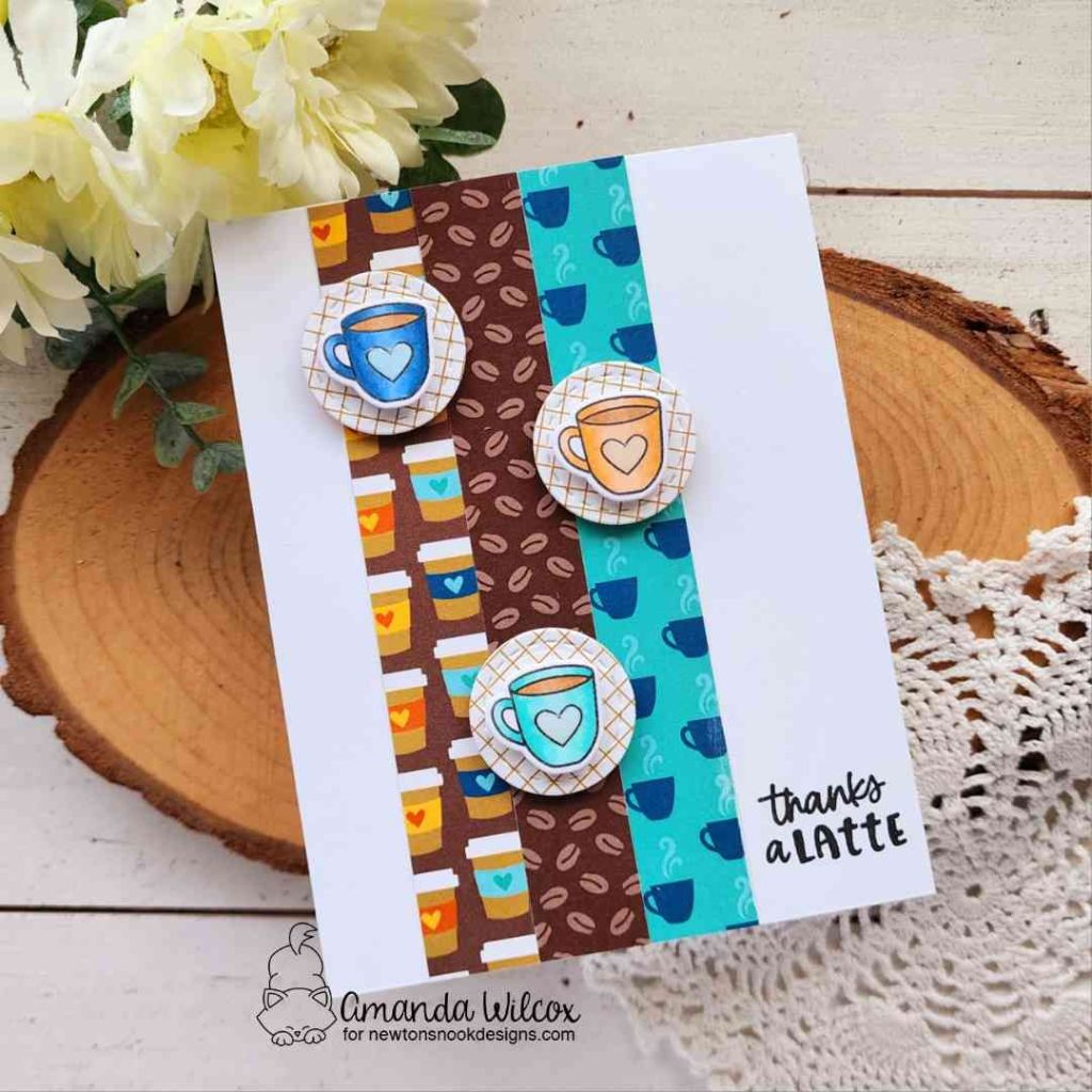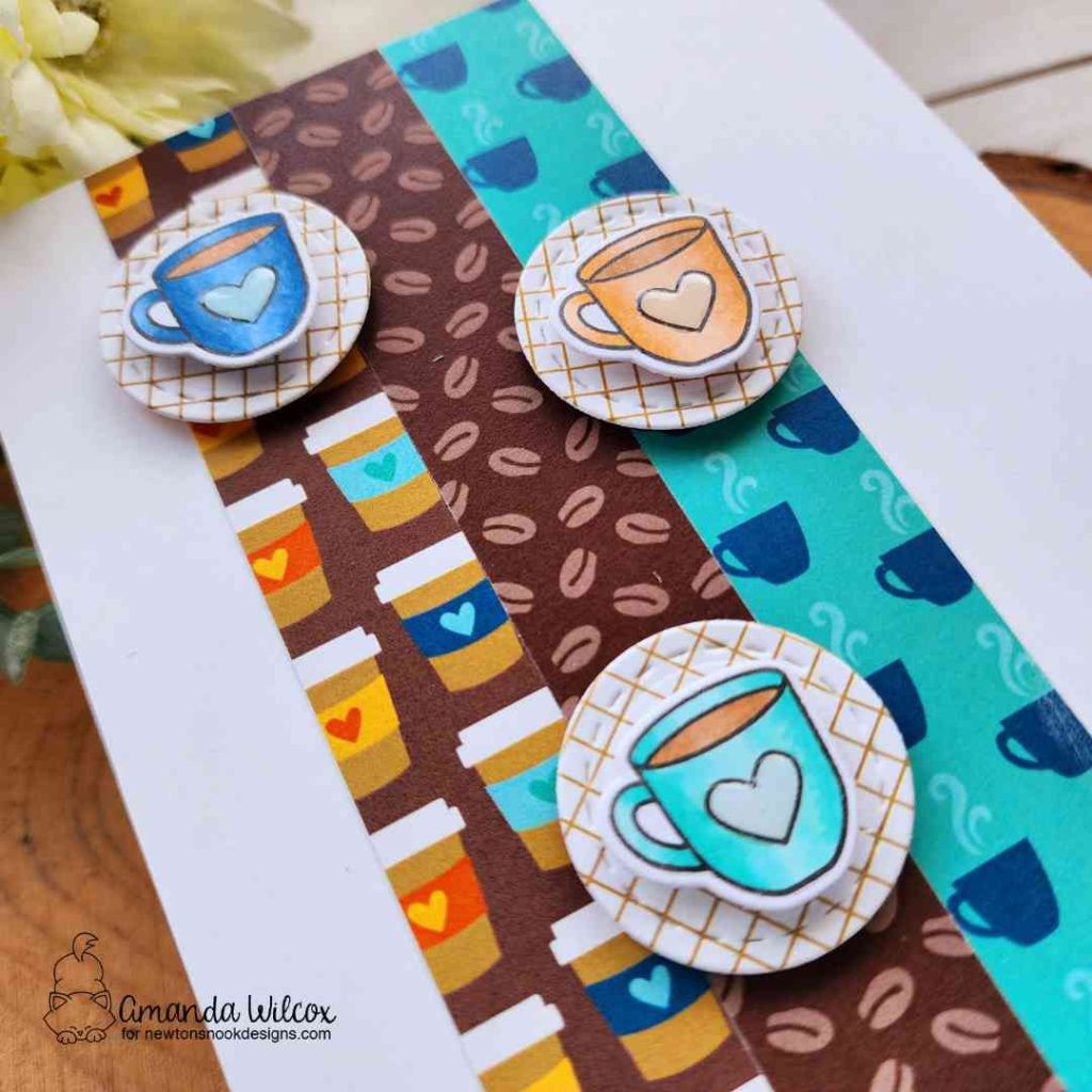 I cut one-inch strips and glued them to a card base. Then cut three circles from another pattern. I stamped three coffee mugs and colored them in coordinating colors and used the coordinating die to cut them all out.