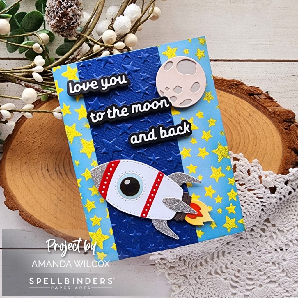My first card features the Starry Night embossing folder and stencils separately. Then I also created the fun rocket and moon from the To the Moon die set. I finished things off with a sentiment built using the Space Greetings dies. I love that they can go from love to birthday to just because with one simple set.