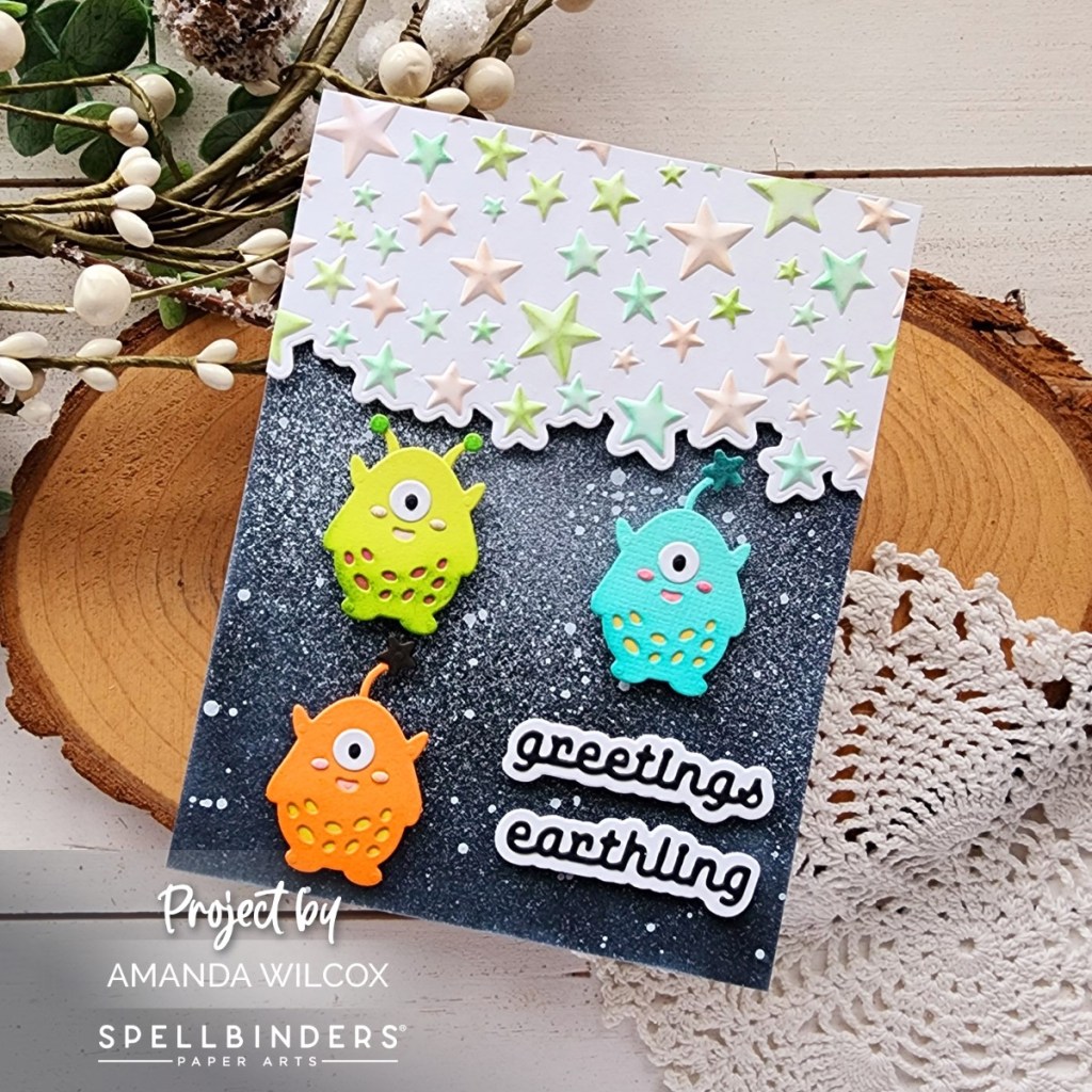 On my card above, I had originally planned to have aliens standing on the planets but realized quickly that there wasn’t enough room. However, creating these aliens was so much fun that I just kept going. That’s how I ended up with this fun design. I also used the Starry Night embossing folder and stencils together on this card. They line up perfectly which makes it easy and fun to color your stars.
