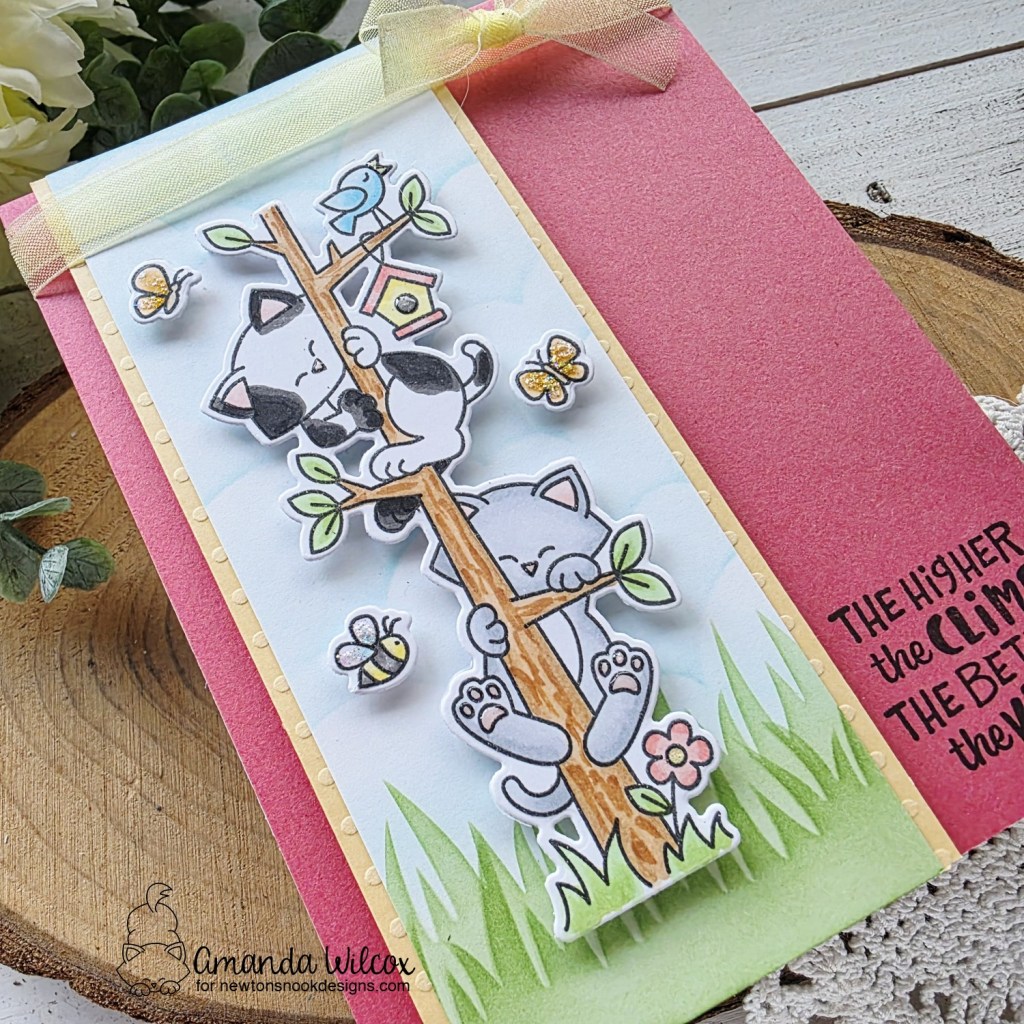 After coloring and die cutting the image, I cut a piece of white cardstock a couple inches wide and stenciled a mini scene with the clouds stencil and hills & grass stencil. I glued that to a piece of yellow cardstock and popped my images up with foam squares.