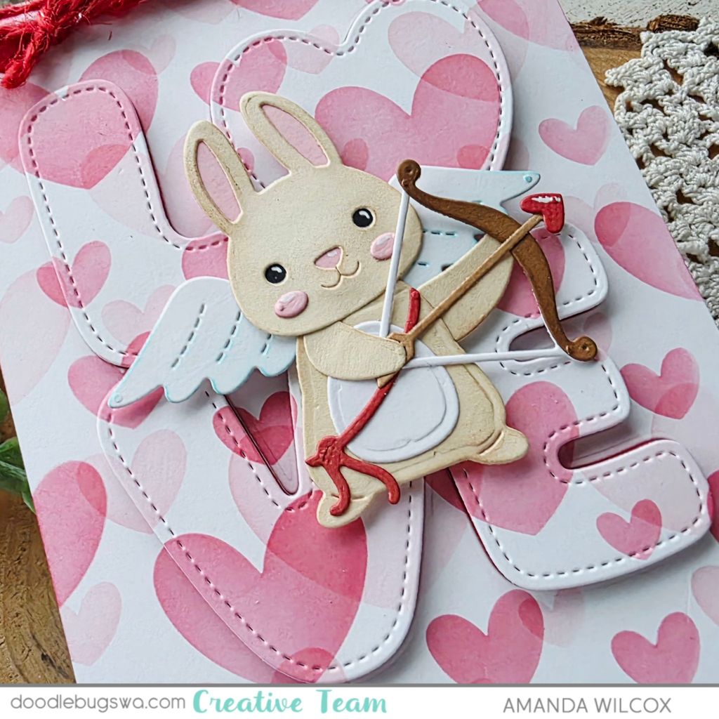 I glued the negative of the panel to a red panel and added that to a card base but it wasn’t working for me. So I popped up the actual die cut for a subtle raised look. Then I added the cupid bunny to that with more foam squares.