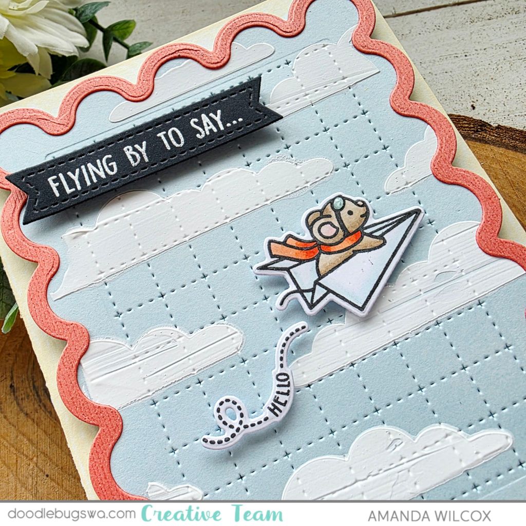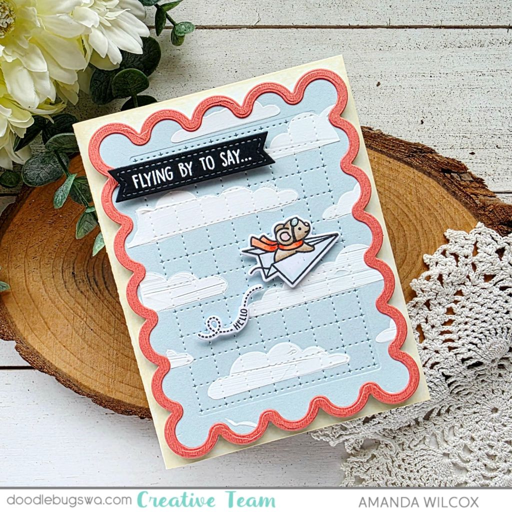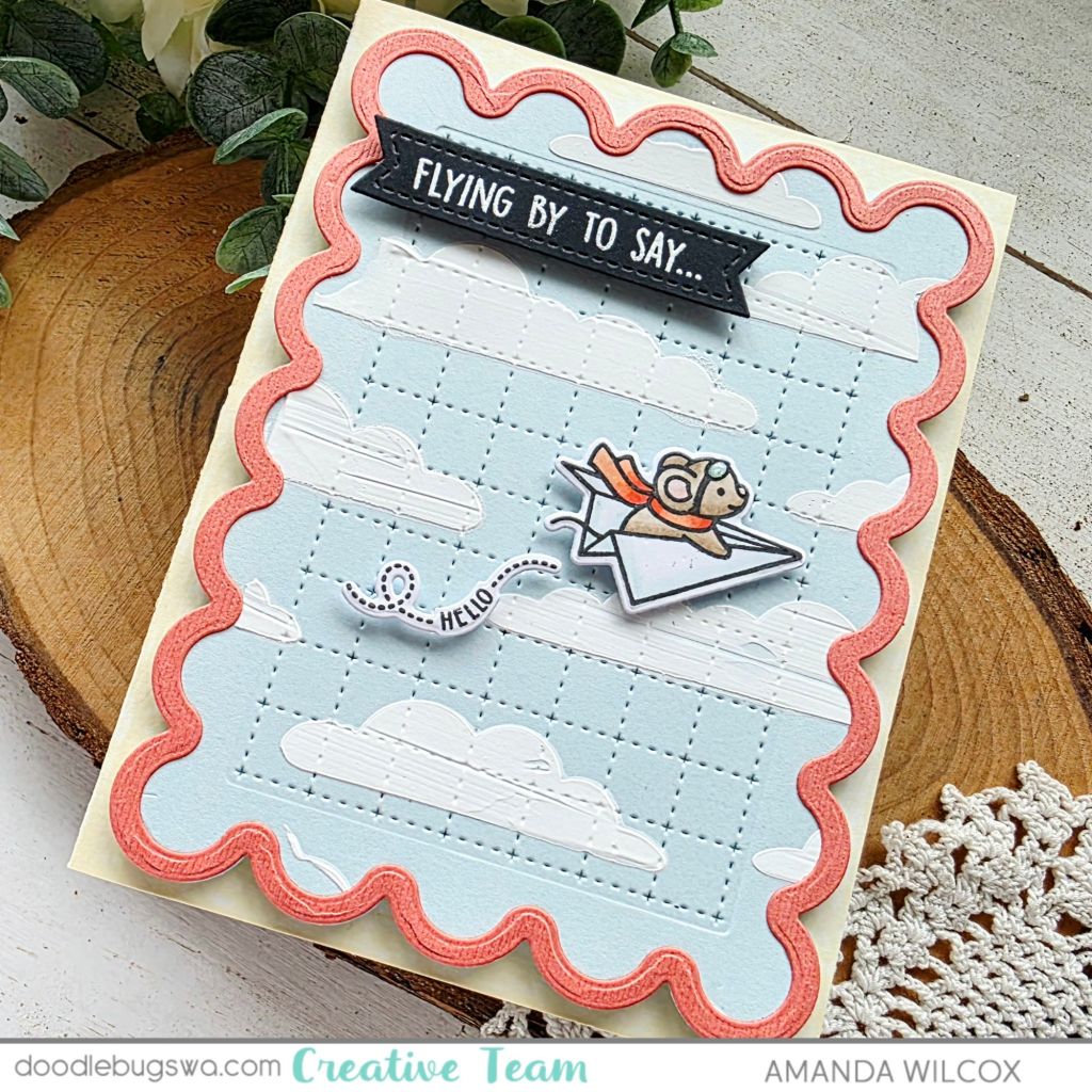 To create this card, I stamped and colored the images from the Lawn Fawn Have a Mice Flight stamp set, then used the coordinating dies to cut them out. Switching gears to my background, I die cut the Mama Elephant Curly Screen Frame from blue cardstock and the frame from melon cardstock.