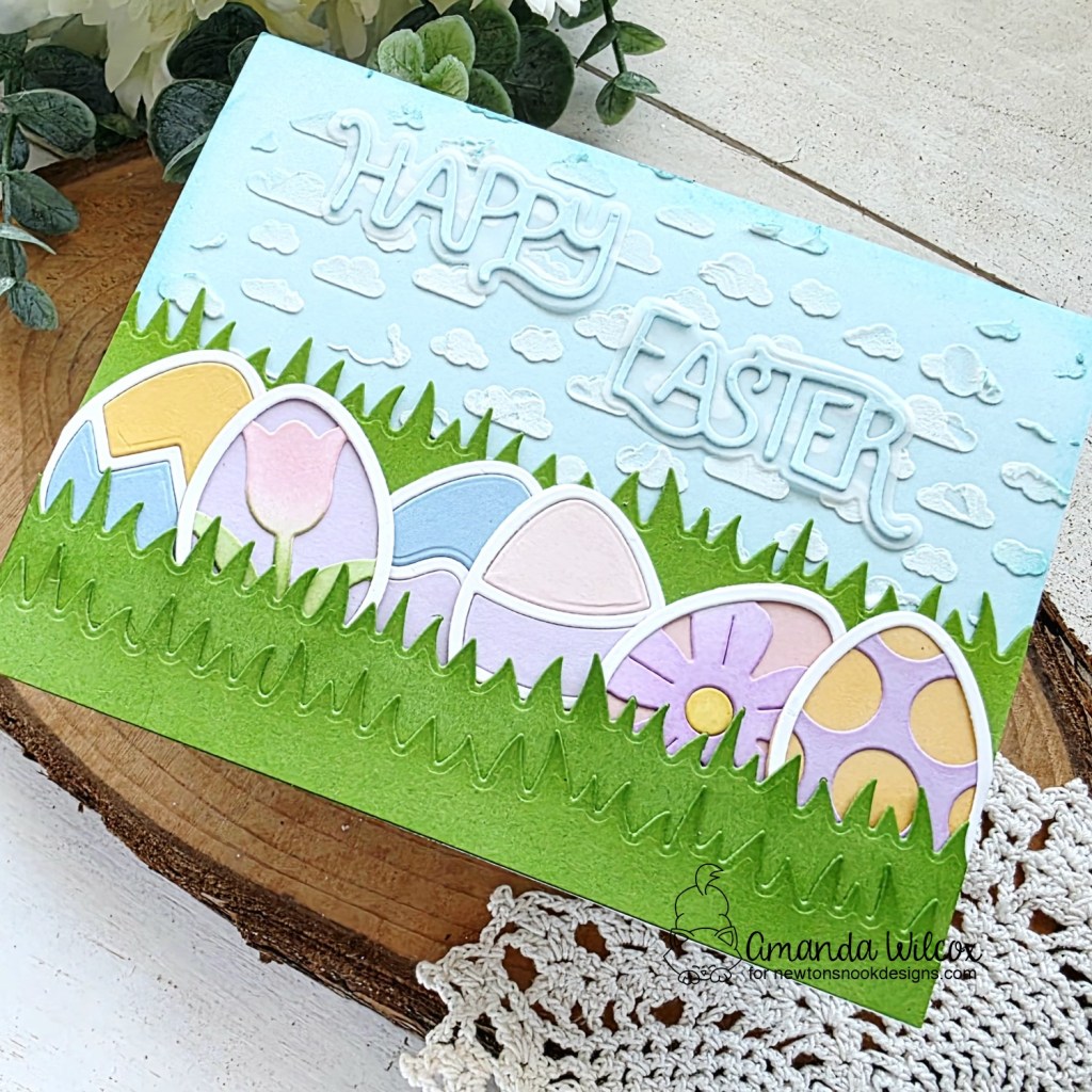 When the clouds were dry, I ink blended the edges of the panel a little for some depth there too. Then I adhered the grass and eggs along with the sentiment to the sky. Then I glued the whole thing to a card base.