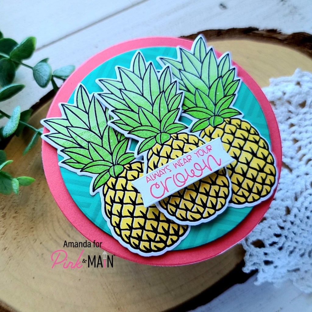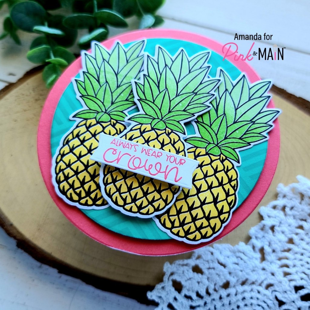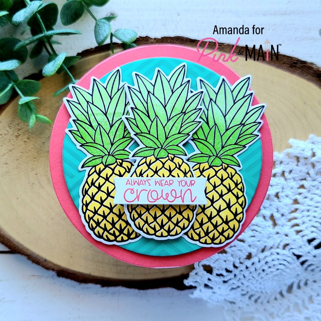 Welcome everyone! Today I’m having a little fun over on the Pink & Main blog today with some royal fruit! I have always loved the sentiment to be a like a pineapple and always wear a crown. It’s fun and reminds us to have confidence and be proud of who we are. Well, the new Pink & Main set called Sweet Friend is a fabulous new set with a couple of gorgeous pineapples and the coordinating stamps to color them in. This isn’t my typical style but it was so fun!
