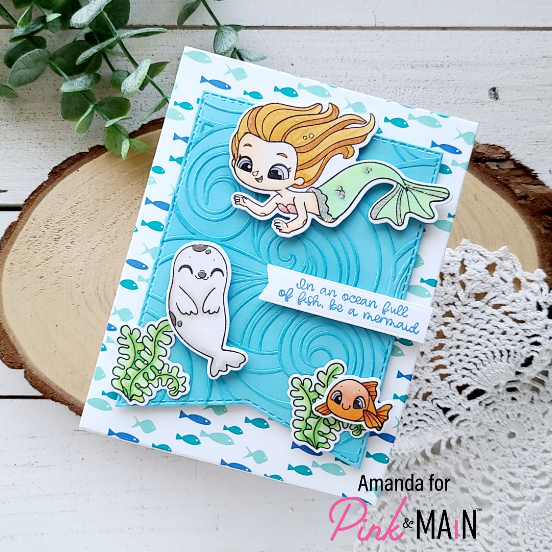 Hello again! Today I’m over on the Pink & Main blog hanging with my mermaid friends! I sure do love them! The cuties in this new stamp set are so much fun and I love the different images where the mermaid is peeking out of the water or her fin is all that’s left from diving down. You can build some awesome scenes with these!