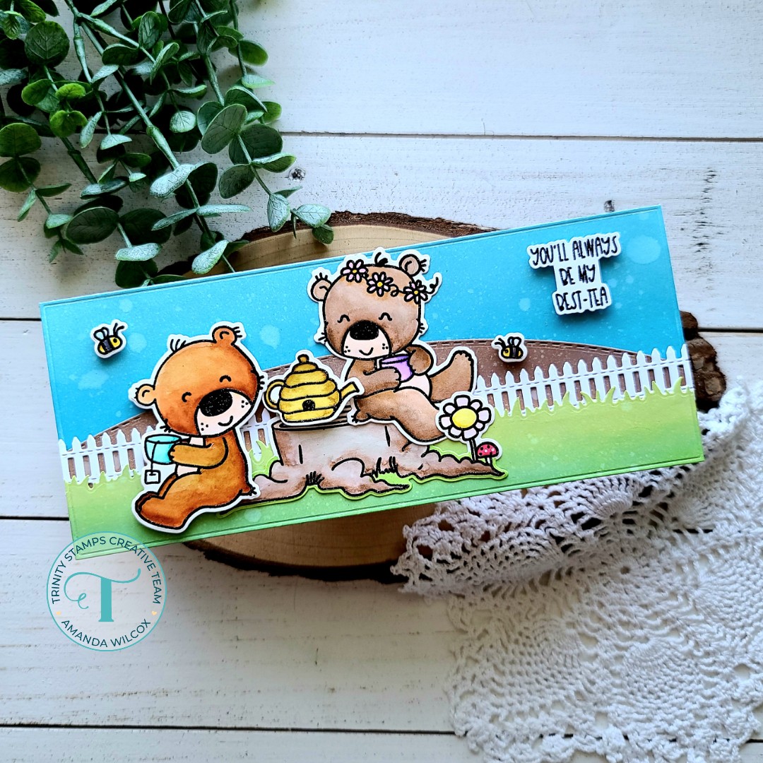 Welcome, welcome!!! Thanks so much for stopping by today. I’m over on the Trinity Stamps blog for another fun Wednesday. Today we’re having a sweet tea party with a couple of adorable bears! I love how large these images are! They fill up a slimline or an A2 size card but they also work wonderfully with the new A7 card size products as well! Today I really wanted to try them on a slimline, so let’s get started.