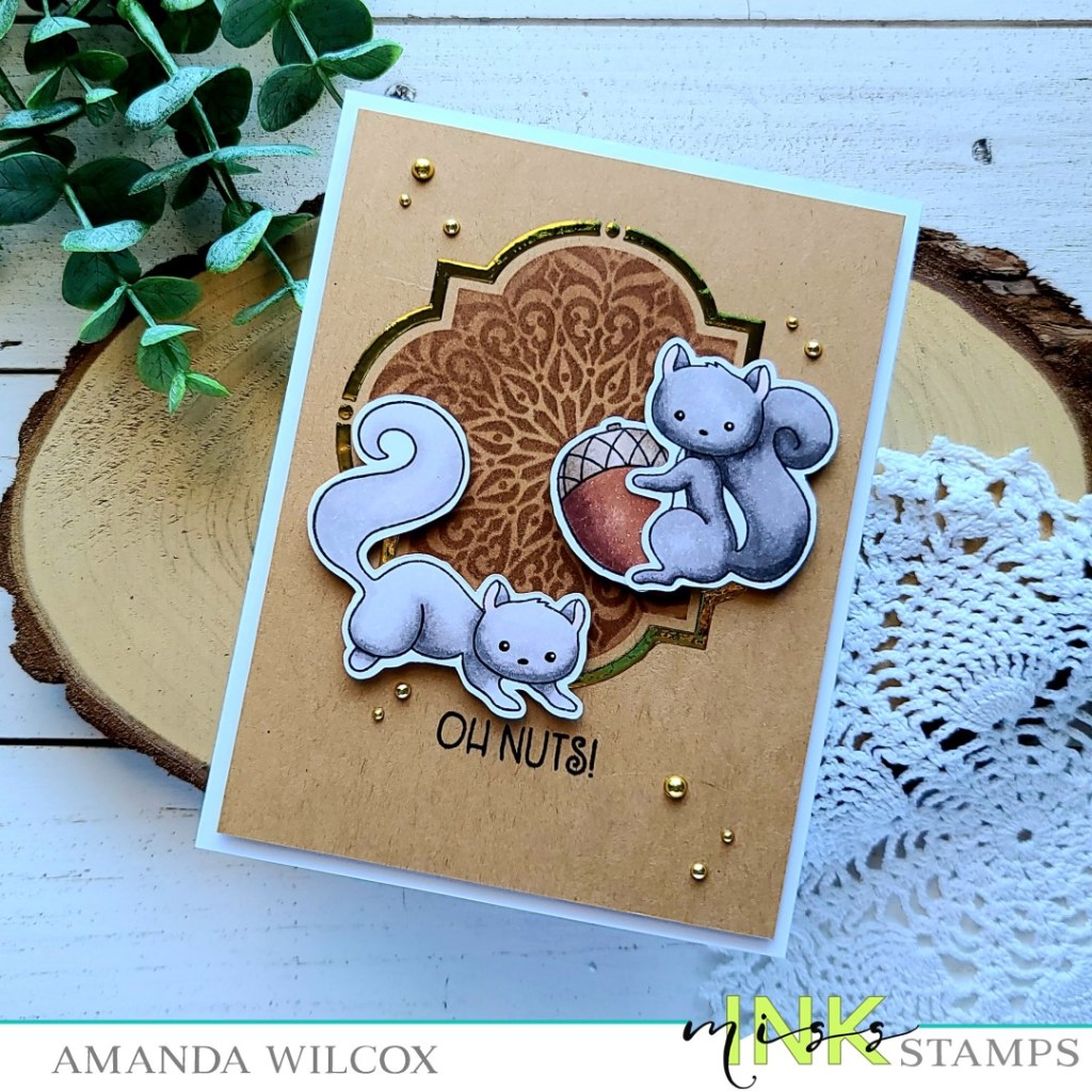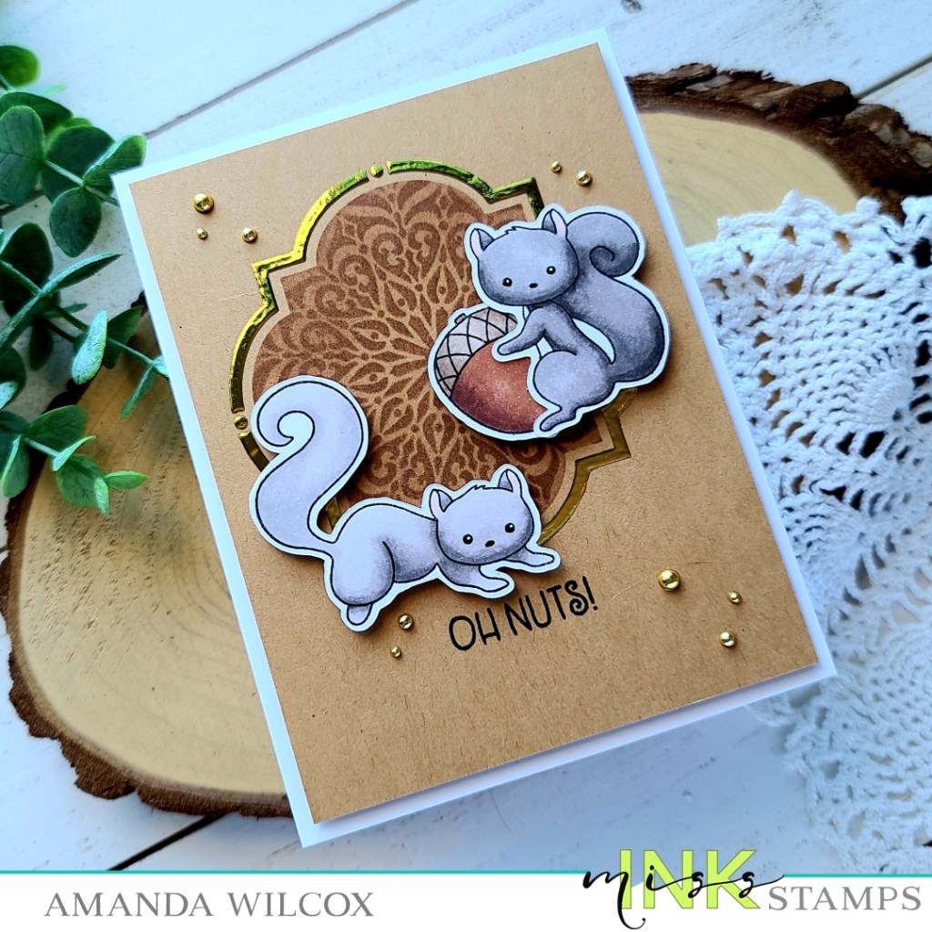 Hey friends! I hope your week is chugging along smoothly. Today I’m popping in with a silly card from Miss Ink Stamps featuring some of my favorite squirrels from Oh, Nuts! I paired them with a little stenciling and decofoil for some texture and shine.