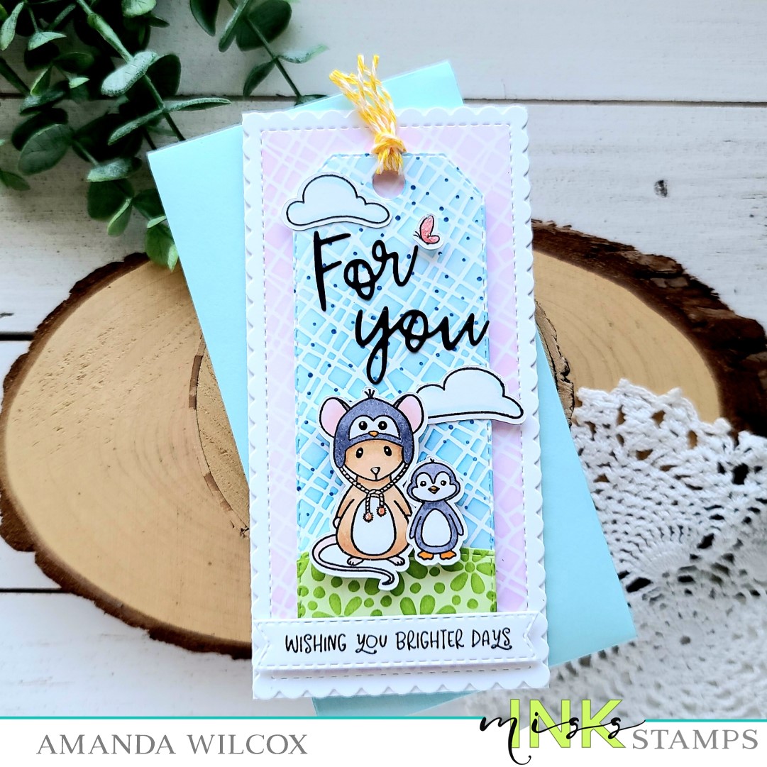 Hello everyone! Today I’m over on the Miss Ink Stamps blog with this sweet little mini slimline card and coordinating envelope. I just love these mice and their sidekicks from Say Cheese! so I pulled out the penguins, which I hadn’t used yet and decided to color them up!