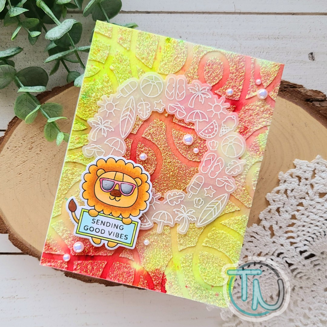 I used the fall bouquet stamps and tried to color them more bright and cheerful to lean toward a more summery bouquet of flowers. I also paired the Ins and Outs Marquis stencil with the Kaleidescope stencil and threw in some awesome iridescent glitter glitz gel over my ink blending for fabulous shimmer and texture in the background!