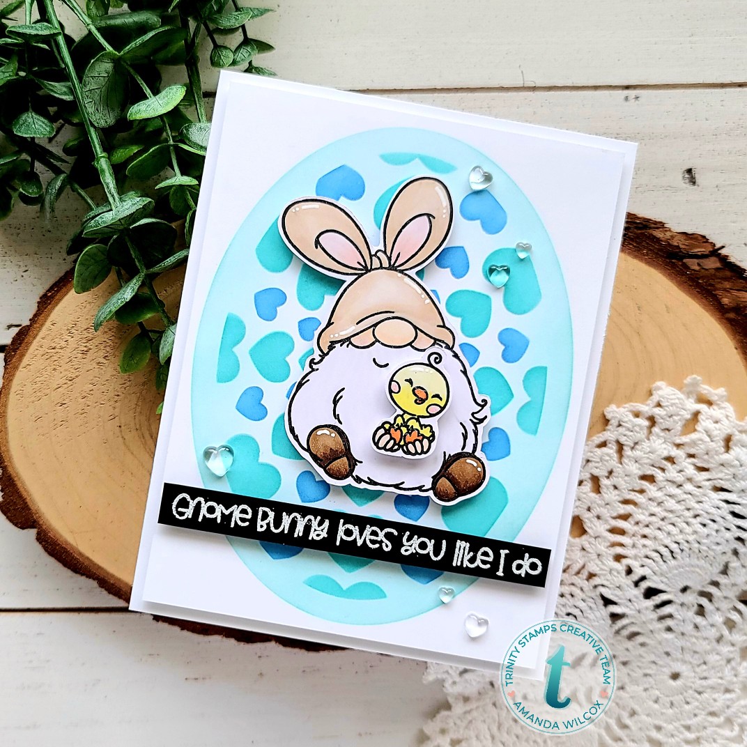 Hi again! I’m over on the Trinity Stamps blog today too and wanted to share the sweet gnome bunny card that I made. I tried to take the Easter sets and give them a different feel for more use throughout the year. So if you have a gnome lover, this just may work for you too!