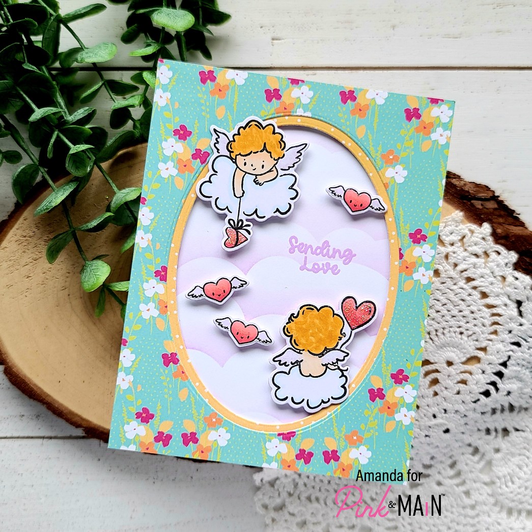 Moving on to assembly, I added foam tape to the stenciled panel and added it to a white card base. The spring roundabout circle was too much with the critters so I added another circle frame from vellum over the top, hiding the glue behind the spring pile up characters when I added them with foam squares. I also added foam to the back of the sentiment banners and popped them in place.