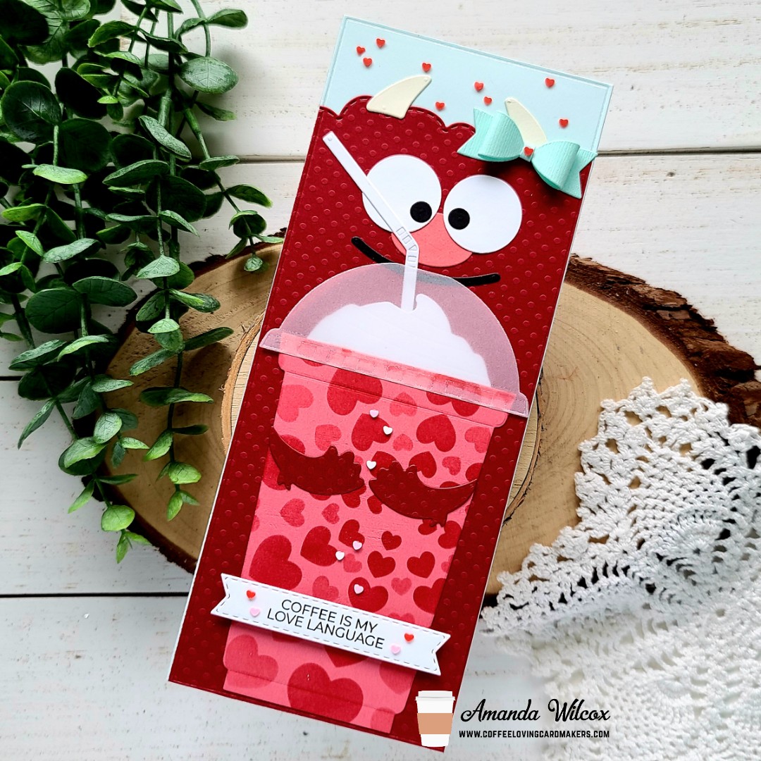 I started this card by die cutting the pieces to my monster using the Make-a-Monster dies. Then I cut the pieces to that yummy frap with the Summertime Sips dies. I took the Heartburst stencil and inked red and dark pink hearts on the cup for a little interest. I die cut the largest Slimline Modern Embossed Panel from light blue and the same red as the monster arms. Then with the red panel I took the cloud die from Slimline Scenic Borders and cut the top off creating some monster hair.